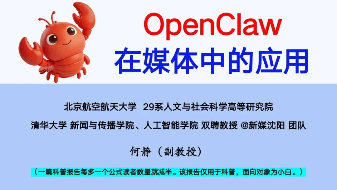 媒体人终于迎来真正的效率革命!清华大学新闻与传播学院、人工智能学院联合北京航空航天大学团队,最新发布《2026 年 OpenClaw 在媒体中的应用报告》,用全场景、可落地、小白也能懂的方式,拆解 AI Agent 如何打通媒体「内容生产 — 传播分发 — 运营复盘 — 决策优化」全链路,把记者、编辑、运营从重复劳动中解放出来。