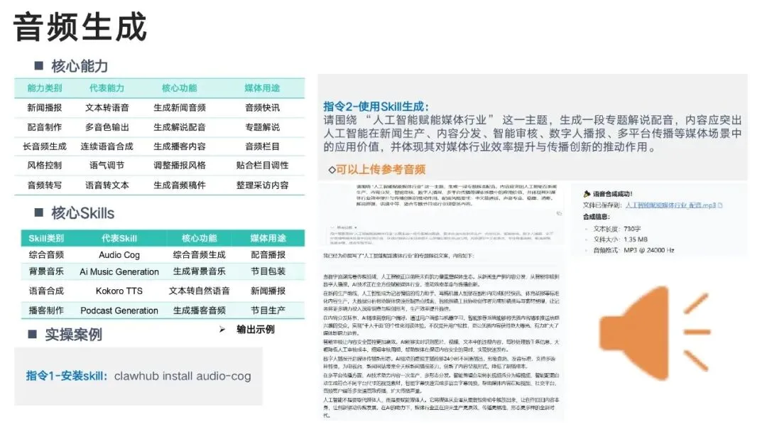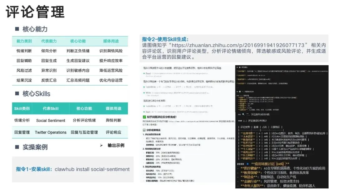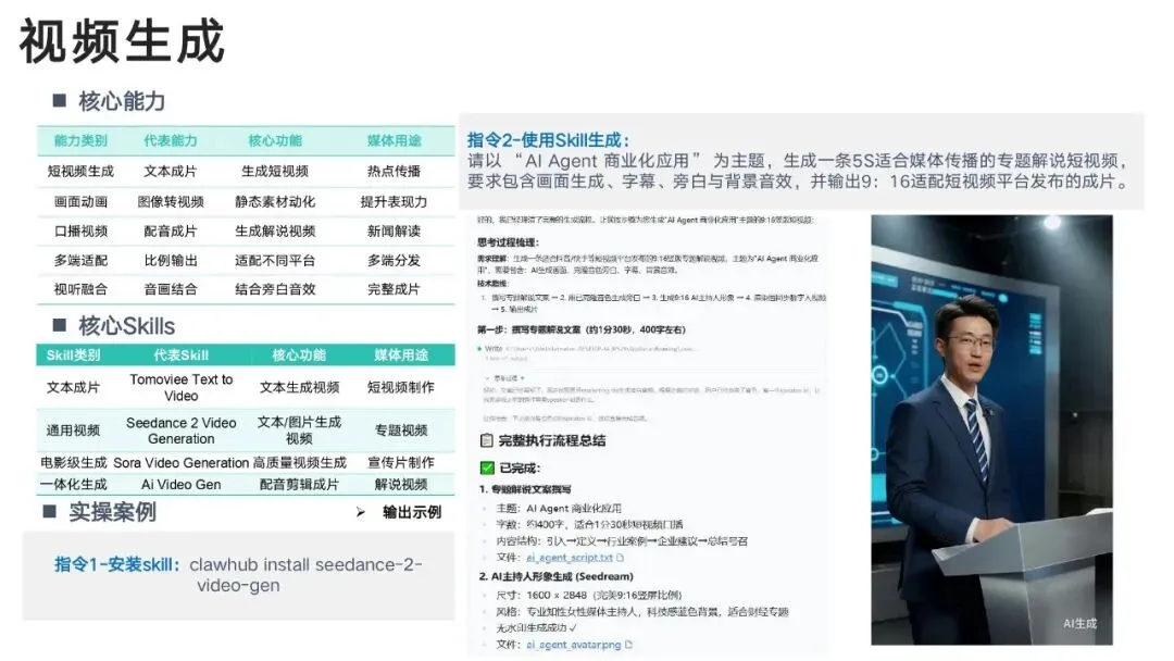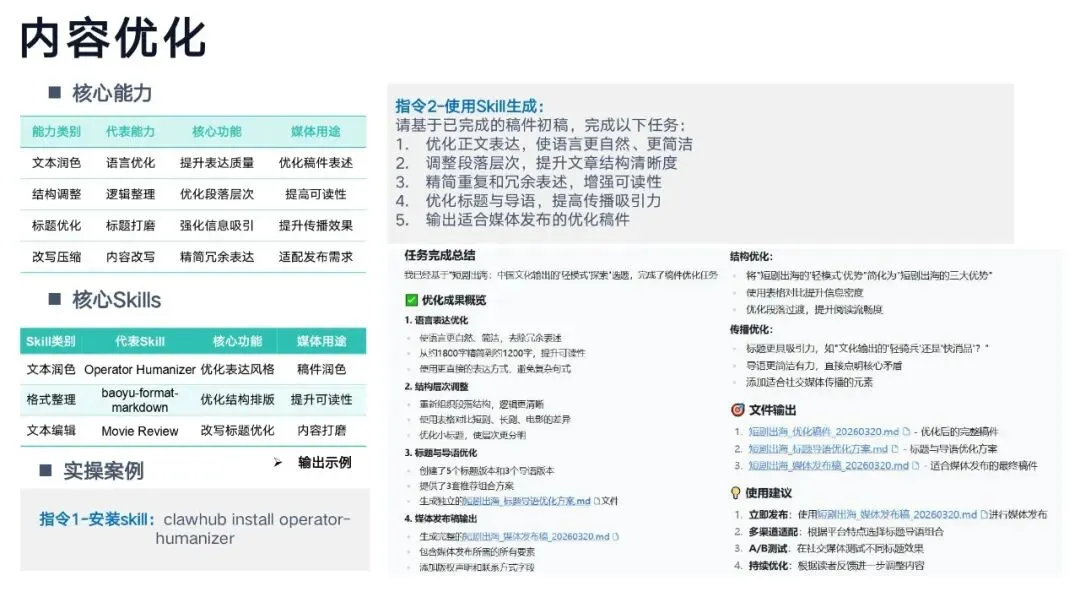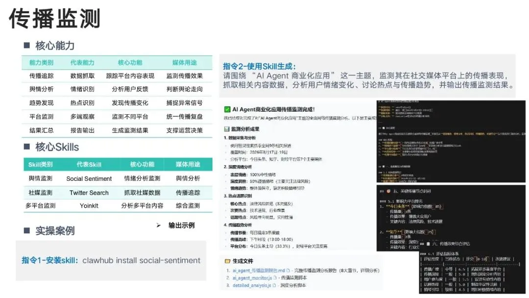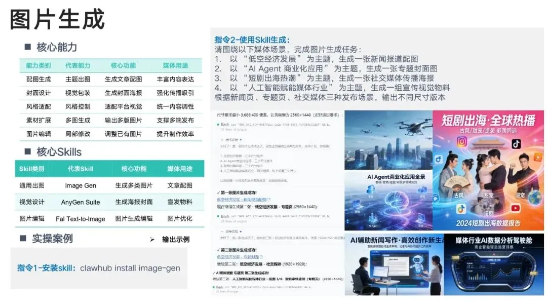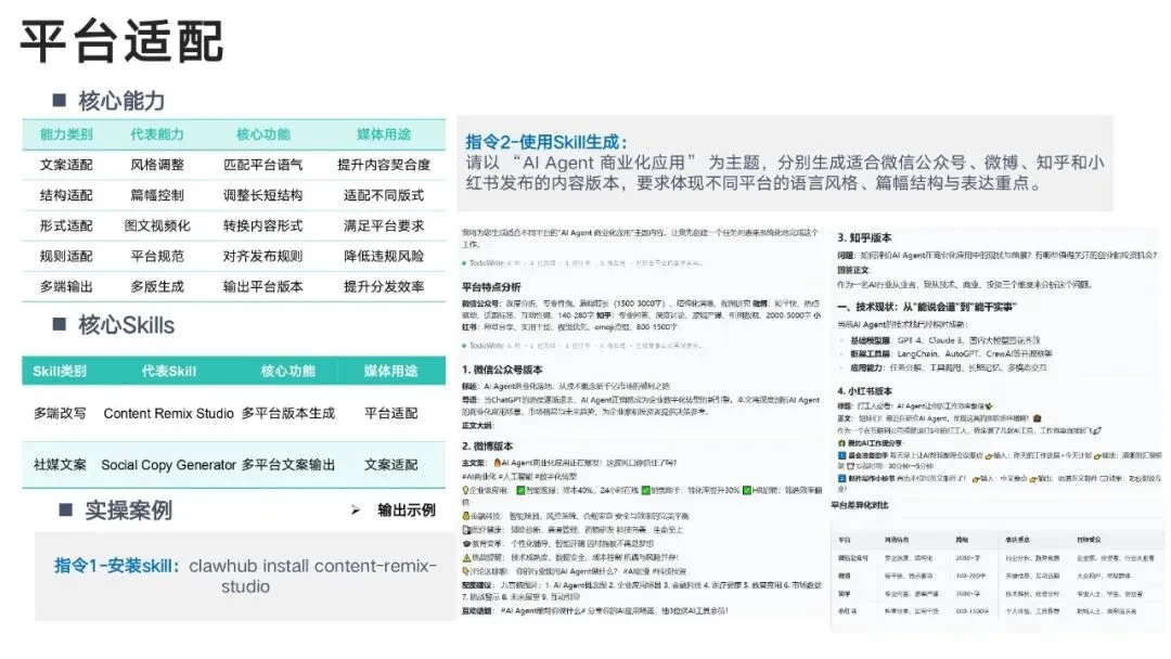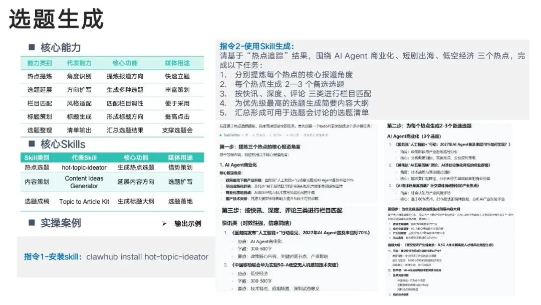 通过 Skills 技能体系,实现:热点自动抓→选题智能出→文案一键写→多图多视频生成→全平台分发→舆情监测→用户分层→效果复盘真正形成闭环智能媒体工作流。