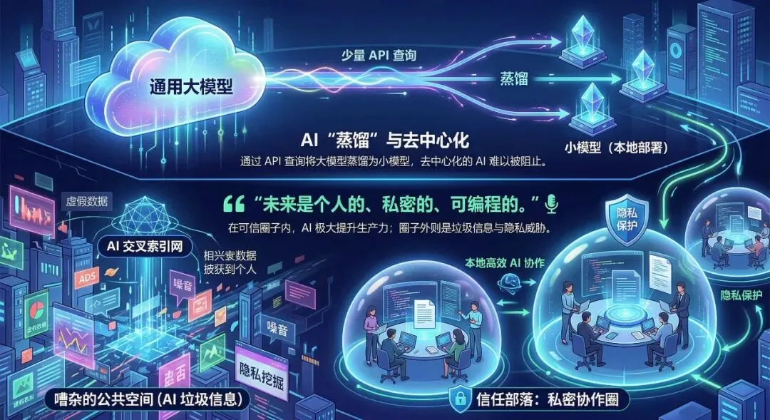 随之而来的是隐私的回归。当公共数据成为"镜厅",任何人都可能被 AI 交叉索引挖掘隐私时,人们将退回到"信任部落"。💬 "The future is personal, private, programmable."(未来是个人的、私密的、可编程的。)在可信圈子内,共享代码库能让 AI 极大提升生产力;而在圈子外,我们将面对海量的 AI 垃圾信息。公共空间充满了噪音,唯有私密协作才能产生真正的价值。🔒