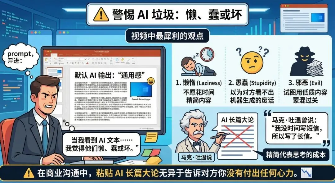 懒惰,是因为他们不愿花时间精简内容;愚蠢,是因为他们以为你看不出这是机器生成的废话;邪恶,是因为他们试图用低质内容蒙混过关。马克·吐温曾说:"我没时间写短信,所以写了长信。"精简是昂贵的,它代表了思考的成本。在商业沟通中,直接粘贴 AI 生成的长篇大论,无异于告诉对方你没有付出任何心力。📉