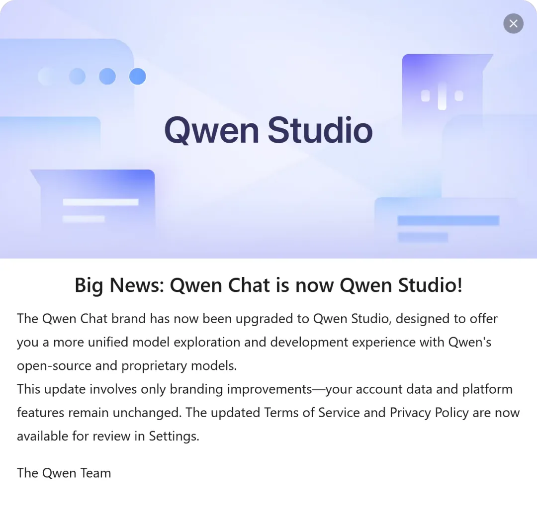 阿里 Qwen 宣布其旗下 Qwen Chat 正式更名为 Qwen Studio。未来,其团队将继续优化该平台的界面与体验,并依据用户反馈制定路线图,以帮助用户更便捷地发现、测试并挖掘 Qwen 模型的全部潜力。 Qwen 官方宣布其旗下 Qwen Chat 现已正式更名为 Qwen Studio。 Qwen Studio 旨在为日常用户和开发者提供支持,允许其统一访问 Qwen 系列的开源和专有模型。 该平台现已全面集成高级多模态理解、实时音视频交互、工具调用,以及 AI 图像与视频生成等核心能力。 未来,其团队将继续优化该平台的界面与体验,并依据用户反馈制定路线图,以帮助用户更便捷地发现、测试并挖掘 Qwen 模型的全部潜力。