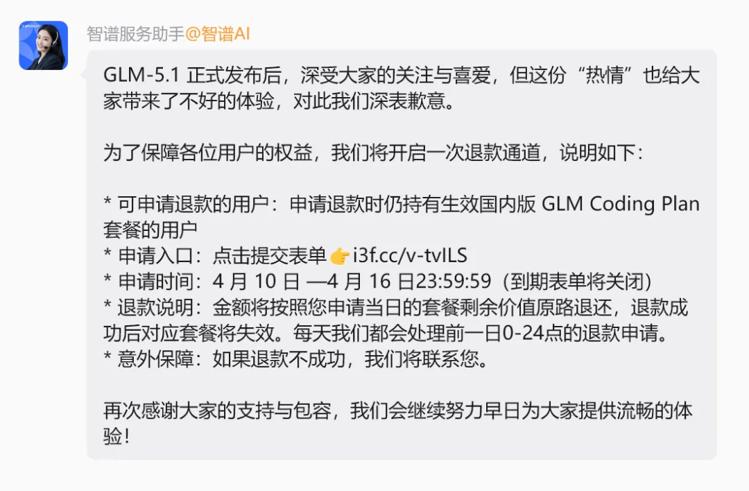 因服务体验不佳,智谱官方发文致歉,并为国内版 GLM Coding Plan 开启了为期 七天 的专项退款通道。 目前仍持有生效套餐的用户可通过指定表单,按剩余价值申请原路退款。退款成功后,套餐失效。 因 GLM Coding Plan 正式发布后用户体验不佳,智谱官方发文致歉并宣布开启专项退款通道。 在官方开启的为期七天的退款窗口期内,申请时仍持有生效国内版 GLM Coding Plan 套餐的用户,可于 4 月 16 日 23 时 59 分 59 秒 前通过指定表单链接 i3f.cc/v-tvILS 申请按当日套餐剩余价值原路退款。退款成功后,对应套餐将失效。 官方每日将集中处理前一日 0 至 24 点的申请批次,并承诺若遇退款失败将主动联系相关用户解决。 未来,该团队将继续致力于提供流畅的服务体验。