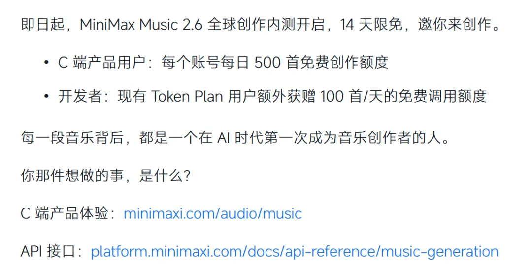 MiniMax 发布了 Music 2.6 音乐模型并开启限免。 该版本在底层能力上进行了系统性升级,重点优化了中低频声学表现、指令控制能力以及首包延迟,并新增 Cover 功能。 此外,同步开源了三个 Music Skill,赋能 AI Agent。 MiniMax 官方发布 Music 2.6 音乐模型并宣布开启全球创作内测,提供为期 14 天的限免政策。 该版本在底层能力上进行了系统性升级,重点优化了中低频声学表现、指令控制能力以及首包延迟。 新增的 Cover 功能允许用户精准提取上传歌曲的旋律骨架,并自由改变原曲的风格、编曲甚至歌词。 此外,官方同步开源了三个 Music Skill,旨在赋能 AI Agent 开发者。 目前,C 端产品用户每日拥有 500 首免费创作额度,现有的 Token Plan 开发者用户每日额外获赠 100 首免费调用额度。