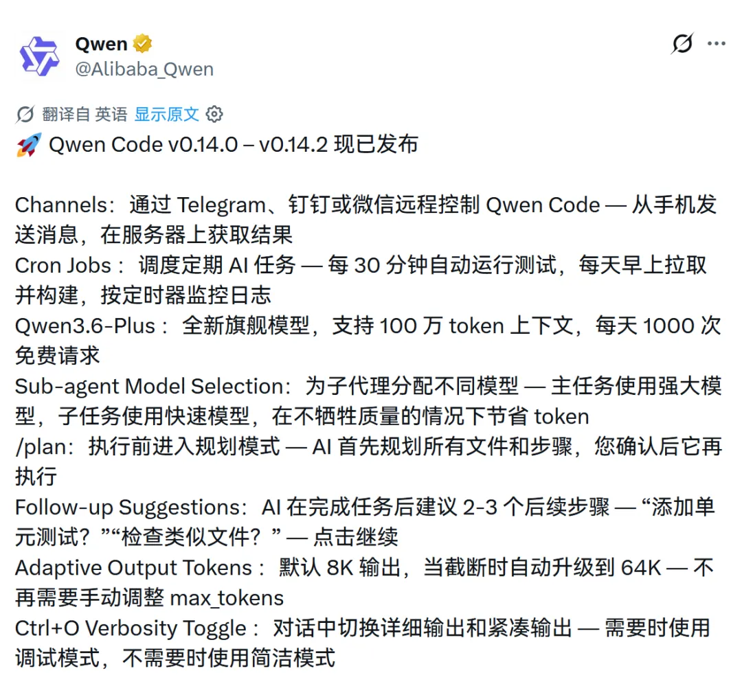 Qwen Code 发布更新,开发者现在能通过钉钉或微信等社交平台用手机远程控制执行代码,并可利用定时任务功能让AI自动运行循环测试。 同时,新版支持在执行前进行全局规划,并为不同子任务灵活分配模型。 Qwen Code 的 v0.14.0 至 v0.14.2 版本现已全面上线。 此次更新引入了多项重磅功能:用户不仅可以通过 DingTalk 或 WeChat 等平台远程控制该工具,实现“手机发消息、服务器收结果”的联动。 还能借助新增的 Cron Jobs 功能,安排如每 30 分钟自动运行测试或每日清晨定时拉取构建等循环 AI 任务。 在任务调度与执行层面,新版支持通过 /plan 命令进入“先规划后执行”模式,并允许用户为不同 Sub-agent 灵活分配模型,以兼顾性能与消耗。 此外,该工具还增加了任务完成后的智能后续建议、默认 8K 且截断时自动扩容至 64K 的 Adaptive Output Tokens。 以及通过 Ctrl+O 快捷键切换输出详细程度等高度实用的交互特性。