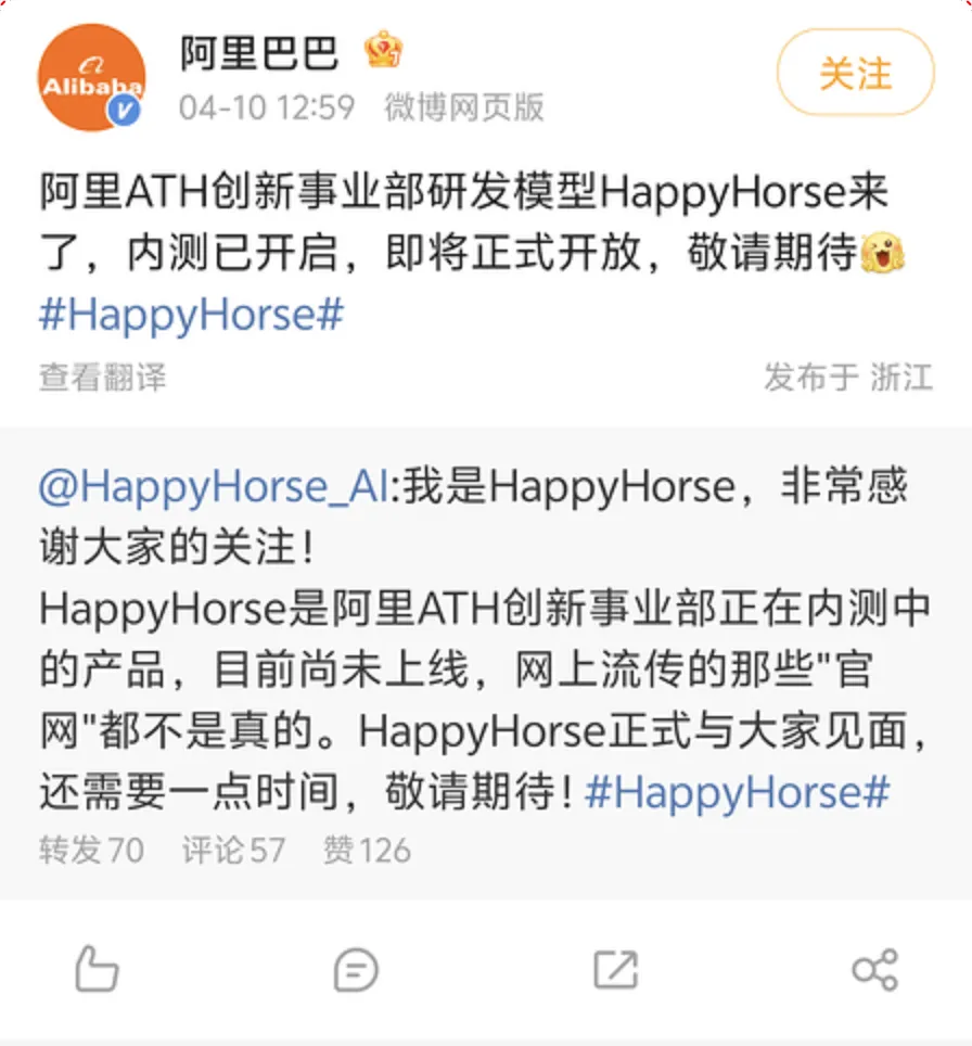 阿里巴巴正式确认,在第三方盲测登顶的视频生成模型 HappyHorse 由其 ATH 创新事业部研发。目前正处于内测阶段,计划后续对外提供 API 接口。 近日,阿里巴巴通过官方渠道正式宣布,此前在第三方测评平台登顶的视频生成模型 HappyHorse 系由阿里 ATH 旗下创新事业部研发。 根据官方声明,该模型目前正处于内测阶段,其 API 将于近期对外开放。 官方同时透露,后续还将陆续推出更多相关产品。