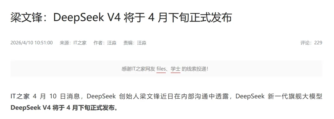 13 媒体称 DeepSeek 预计本月下旬正式发布 DeepSeek V4