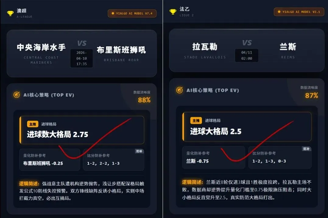 【回顾内容】昨天整体战绩5场收获2红。最大亮点当属澳超的水手vs狮吼,Yi-Algo AI量化分析模型精准捕捉机构反诱陷阱,不仅核心大格局顺利打出,更完美命中 2-2 赛果斩获双项红,尽显极致的风控避险与卡位预测功力;同时法乙亦稳稳拿捏大格局。针对德乙极端洗盘及英冠沉闷零封等意外黑单,Yi-Algo AI 已自动录入赛果残差数据,并动态调低此类深度诱导的特征权重,持续进化模型鲁棒性。