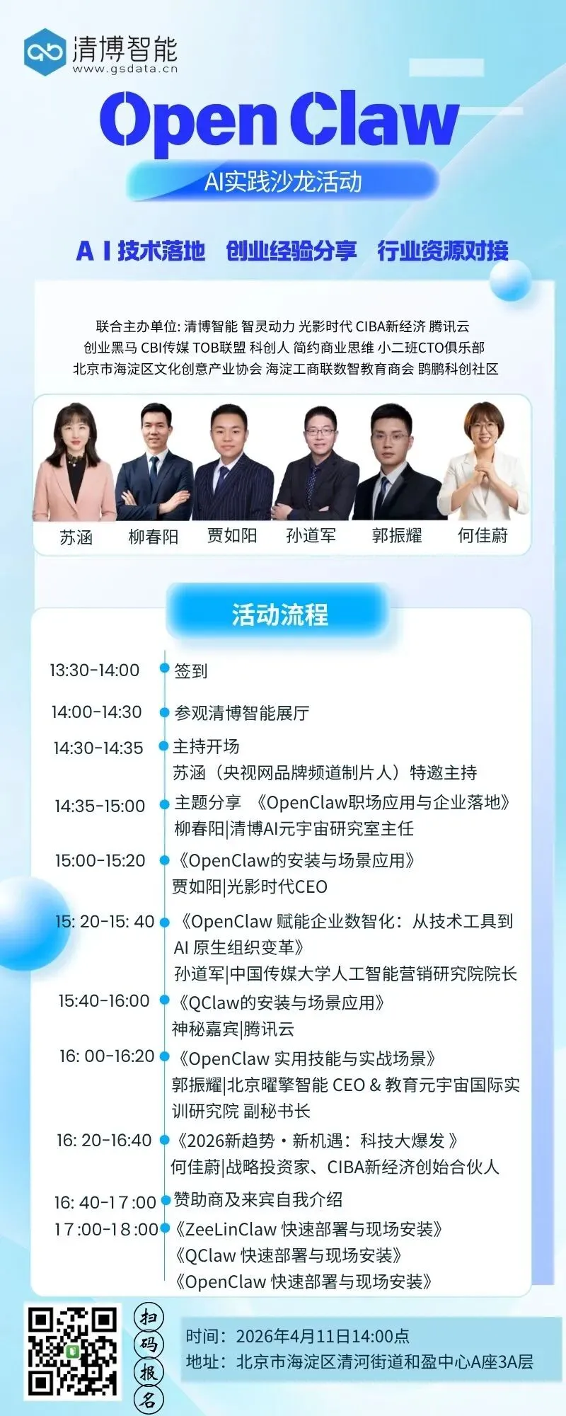 OpenClaw实践沙龙4月11日于北京启幕:解锁AI技术落地新可能!AI正从实验室加速冲向产业一线,如何有效落地、融入行业血脉,已成为创新与转型的关键。由清博智能携手联合主办单位(智灵动力、光影时代、CIBA新经济、腾讯云、创业黑马、CBI传媒 、TOB联盟、科创人、简约商业思维、小二班CTO俱乐部、北京市海淀区文化创意产业协会、海淀工商联数智教育商会、鹍鹏科创社区)共同主办的“OpenClaw AI实践沙龙”,将于4月11日在北京举行!本次沙龙以“AI技术落地、创业经验分享、行业资源对接”为核心,为从业者、创业者和关注AI发展的各界人士打造一场干货满满的实战交流平台。央视网品牌频道制片人 苏涵 特邀主持;清博AI元宇宙研究室主任 柳春阳、光影时代CEO 贾如阳、中国传媒大学人工智能营销研究院院长 孙道军,北京曜擎智能 CEO 郭振耀、战略投资家、CIBA新经济创始合伙人何佳蔚,以及来自 腾讯云 的神秘嘉宾将齐聚一堂。分享话题涵盖 OpenClaw职场应用与企业落地、安装与场景操作、赋能企业从工具到AI原生组织的变革,以及 QClaw的安装与场景应用——既有技术实操,也有战略前瞻,全面呈现AI落地的多元可能。活动内容丰富多样,干货满满。在主题分享环节,嘉宾们将围绕“OpenClaw职场应用与企业落地”“OpenClaw的安装与场景应用”“OpenClaw赋能企业数智化:从技术工具到AI原生组织变革”等多个前沿话题展开深入探讨,为参会者呈现一场AI技术的知识盛宴。无论是技术实践的宝贵经验,还是行业发展的新趋势、新机遇,都将在活动中一一揭晓。