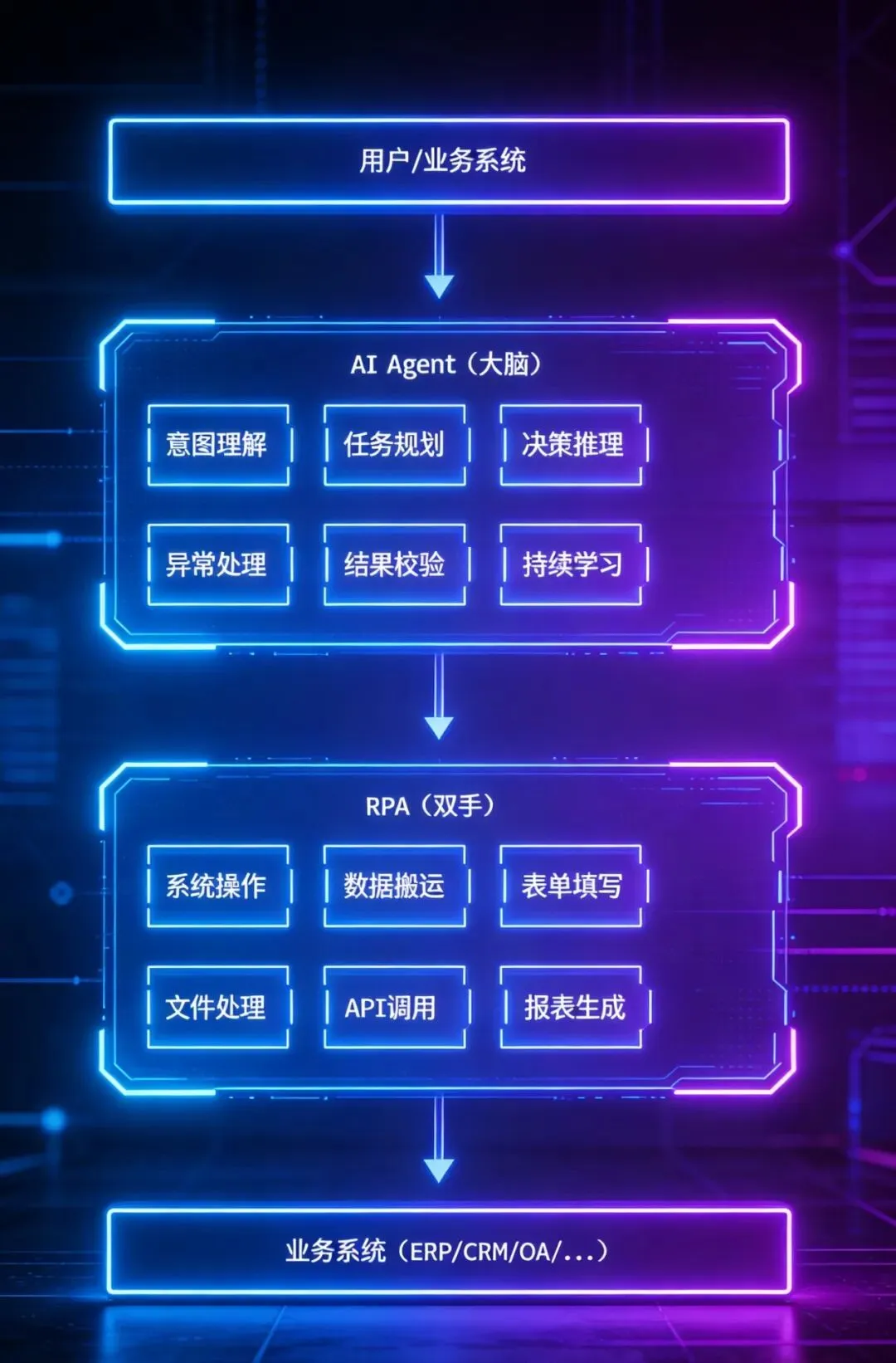 RPA解决了"怎么做"的问题,AI Agent解决了"做什么"的问题。