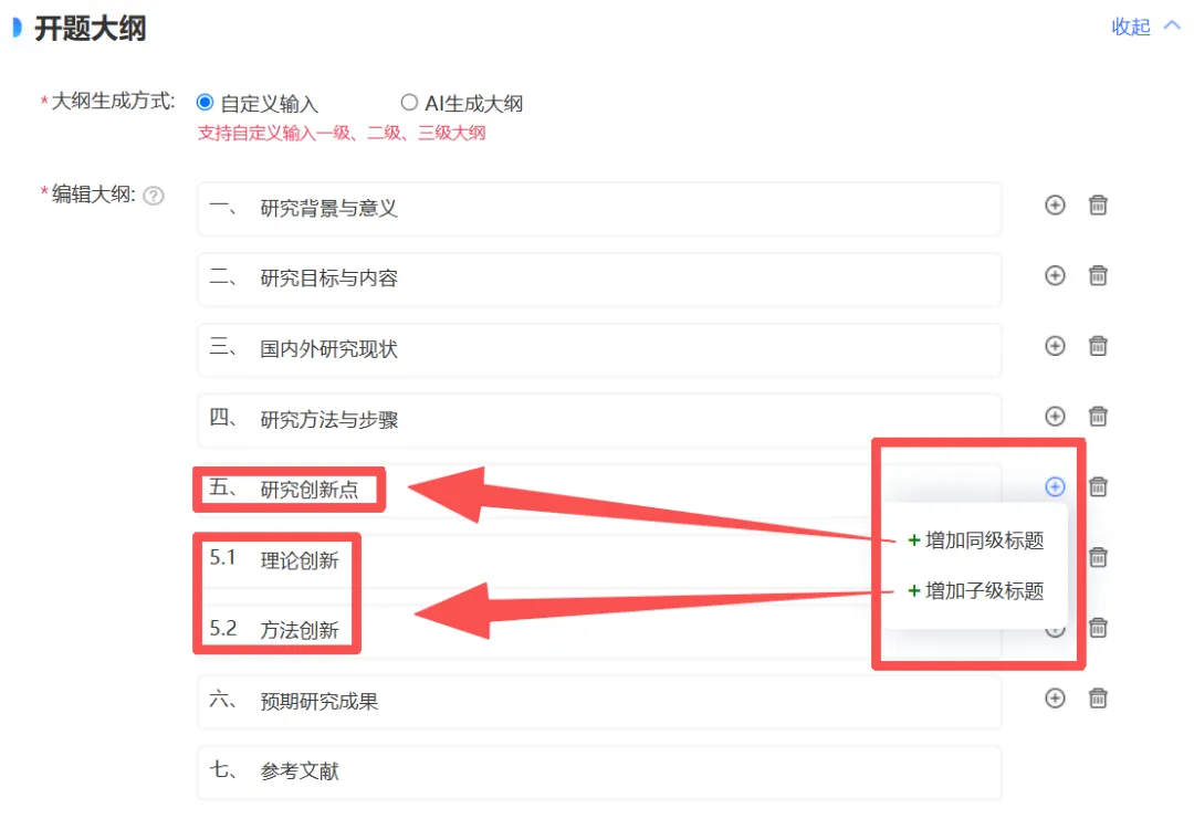 ②有自己的想法?能手动输入一级、二级、三级标题,