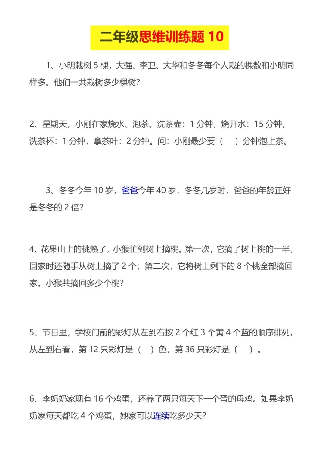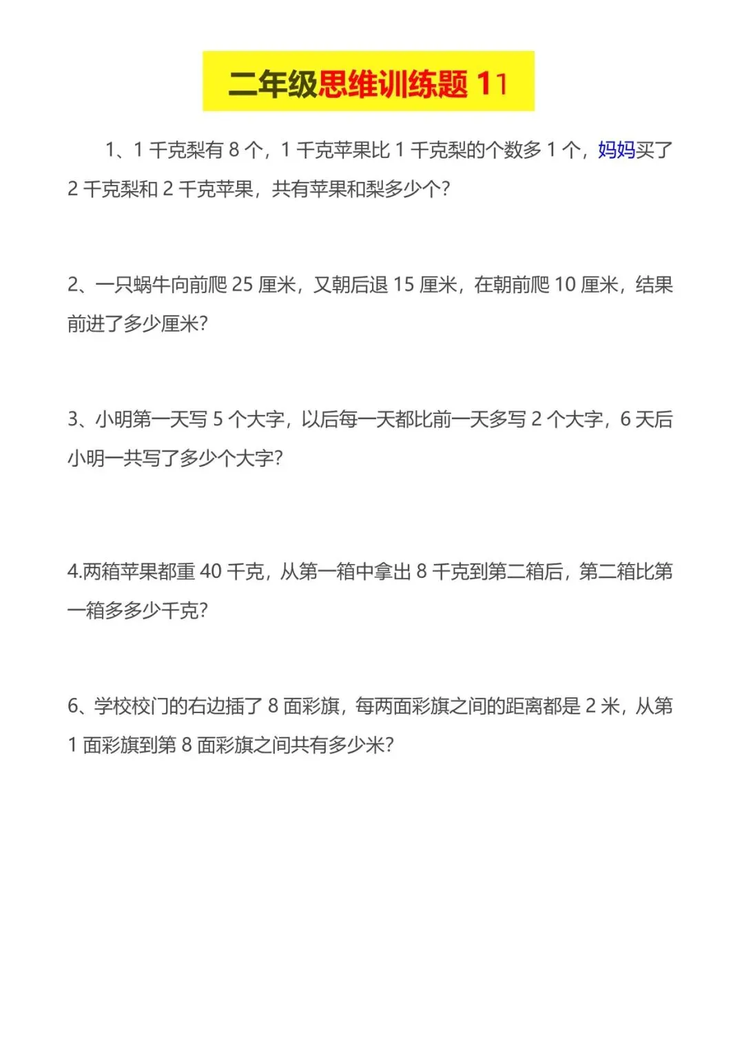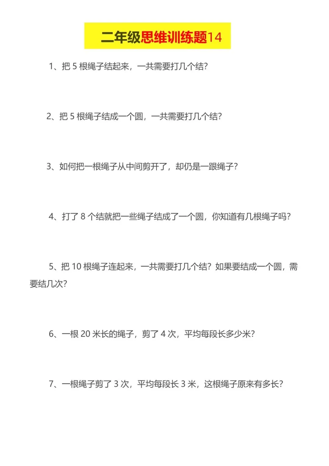 本资料专为二年级下册数学思维提升设计,共包含 14 套完整思维训练题,贴合低年级数学核心知识点,涵盖加减混合运算、倍的认识、除法应用、图形推理、数的规律、简单推理、生活实际应用题等思维考点。
