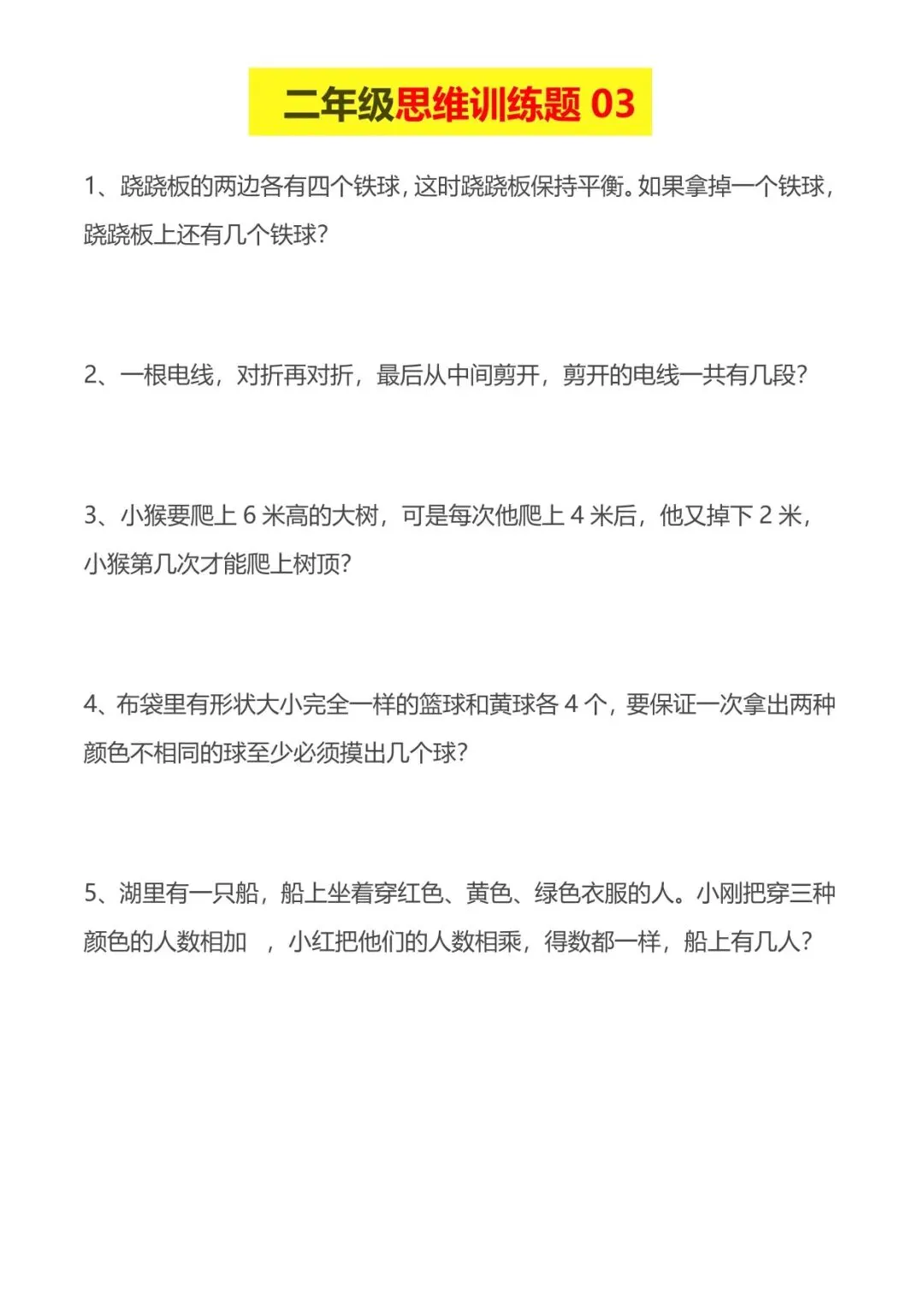 每套题目难度循序渐进,由基础思维题到提升拓展题,题型灵活多样、贴合课本又高于课本,侧重培养孩子的逻辑思维、解题思路和应变能力。排版清晰、留白充足,可直接打印使用,每套均配套完整答案及简单思路解析,适合课后每日练习、周末提升、单元拓展,帮助孩子突破常规解题思维,夯实数学基础,提升思维敏捷度,为后续数学学习打下坚实基础。