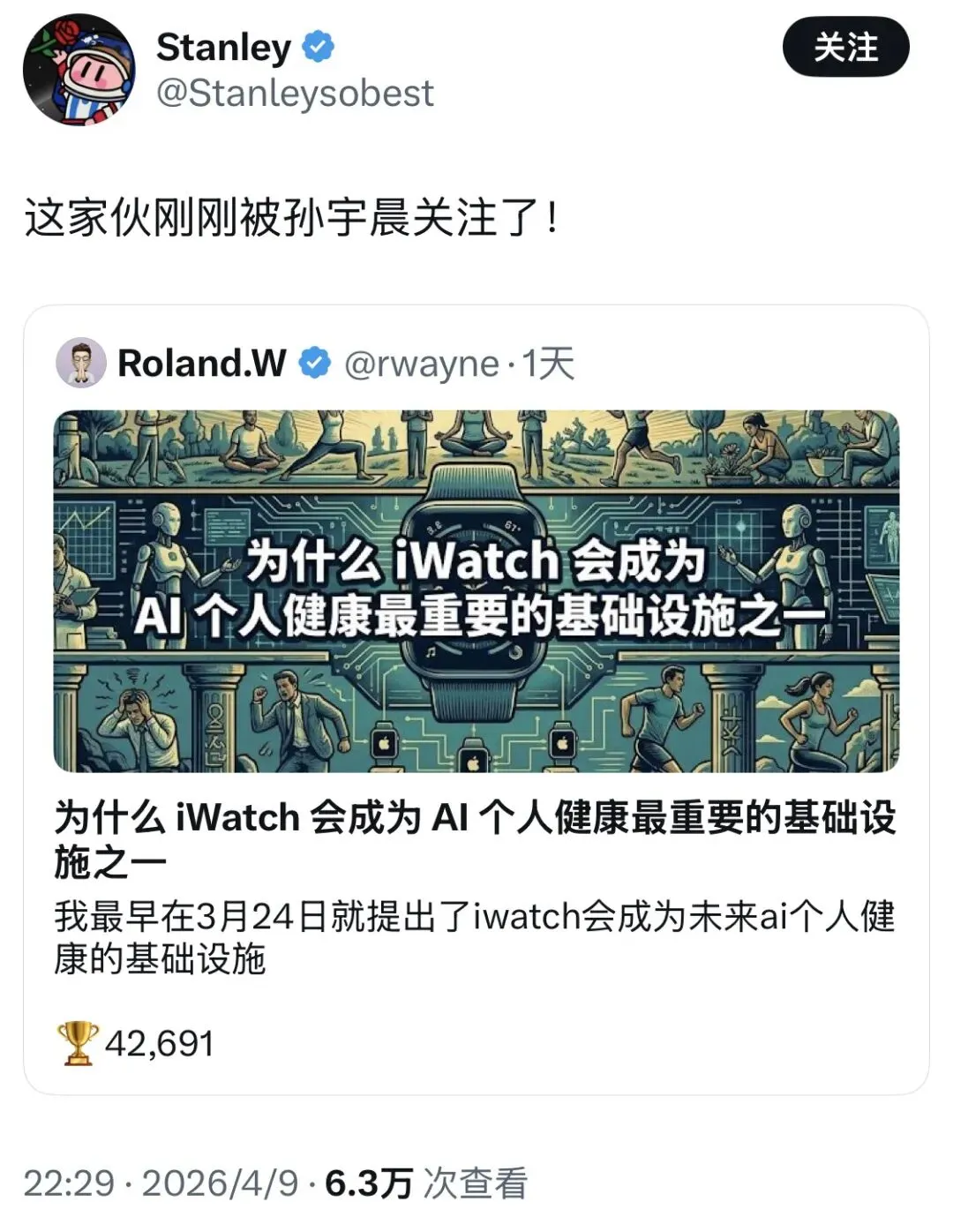 孙宇晨最近在自己主持的Twitter Space直播过程中讲了一个观点:Apple Watch会成为AI时代个人健康的核心基础设施。这话他不是随口说的,而是面对着所有媒体群体公开提出。