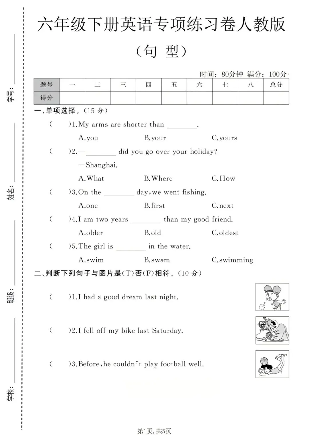 试卷排版规范、题量充足,含单项选择、句型转换、完成句子、按要求改写句子等多种题型,紧扣单元重点与易错考点,难度贴合考试要求。整套为空白练习卷 + 完整答案,可直接打印使用,适合单元巩固、专项突破、期中期末复习,帮助学生熟练掌握各类句型结构,提升语法运用与答题正确率。
