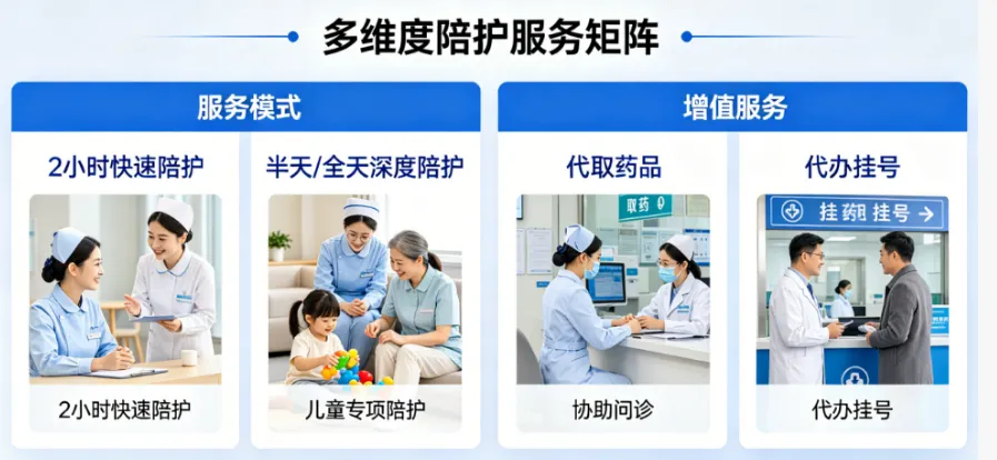 系统支持2小时快速陪护、半天/全天深度陪护以及儿童专项陪护等多种模式。同时配套代取药品、协助问诊、代办挂号等增值服务,全面覆盖用户从入院到离院的各种需求。