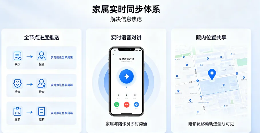 实时语音对讲: 家属可随时与陪诊员建立沟通,即时获取老人或病患的现场状态。