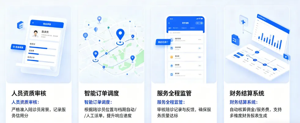 人员资质审核: 严格准入陪诊员背景,记录服务信用分。