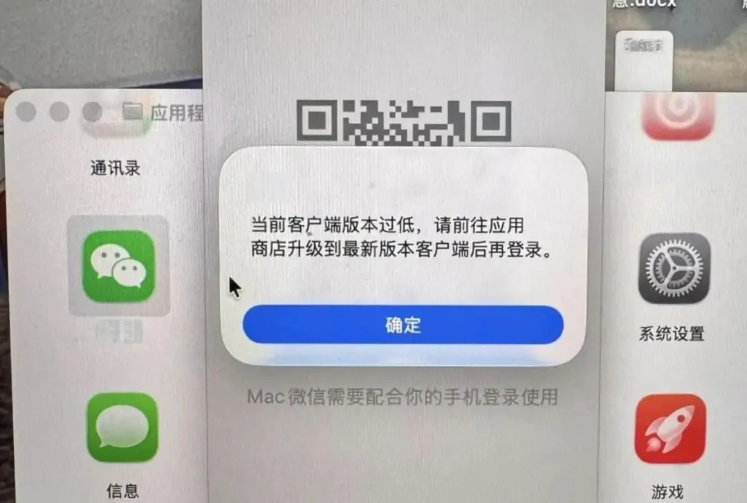 苹果电脑MacBook安装微信macOS低版本 最近修电脑收到很多客户反映App Store的微信安装不上,提示系统版本太低要升级到12或者MacOS的微信突然提示“版本过低无法登录”,出问题的大部分是老款电脑。以下是解决办法:第一步,打开浏览器,搜索“微信3.8.10 Mac 版”,认准正规下载页面进去。千万别点那些不明来源的链接,安全第一!这里推荐一个网址:http://wybuct.ys168.com/第二步,点击“下载”,等.dmg安装包下载好后双击打开。这时候会出现一个窗口,左边是微信图标,右边是应用程序文件夹。第三步,按住微信图标,拖拽到右边的“应用程序”文件夹里。如果提示“是否替换旧版本”,点击“替换”!这时候,新版本就正式安装上了。第四步,因为是从网页下载的,Mac系统可能会提示“来自不明开发者”。这时候,去“系统设置” -> “隐私与安全性” -> “安全性”里,点击“仍要打开”,然后输入密码验证一下就好了。按照这四步操作下来,99%的情况都能解决版本过低无法安装或无法登录的问题。以后遇到软件罢工,优先尝试打开浏览器去官网下载最新版,比等App Store靠谱多了!