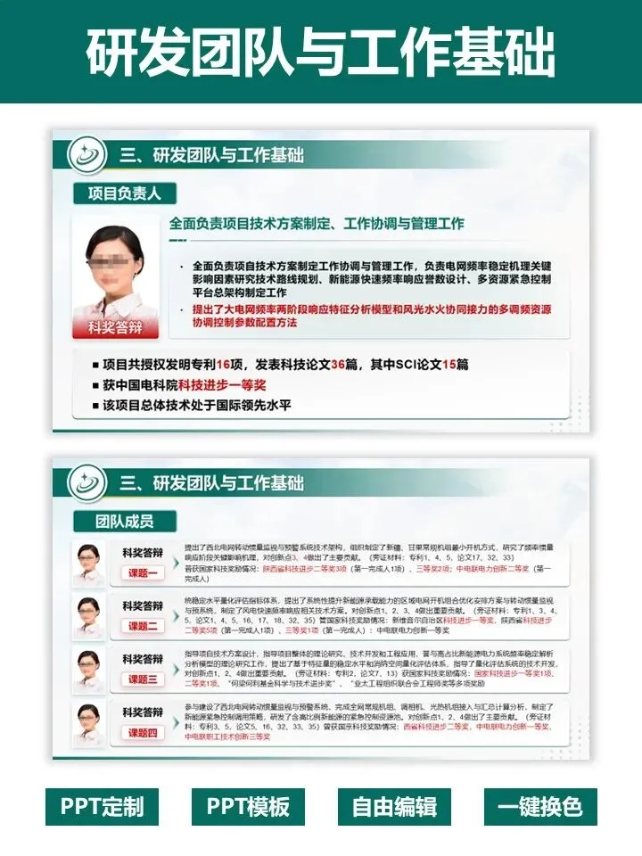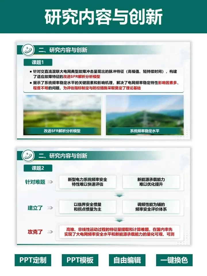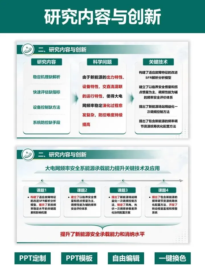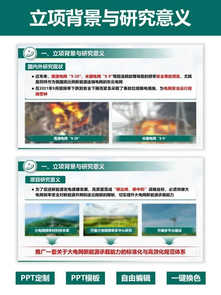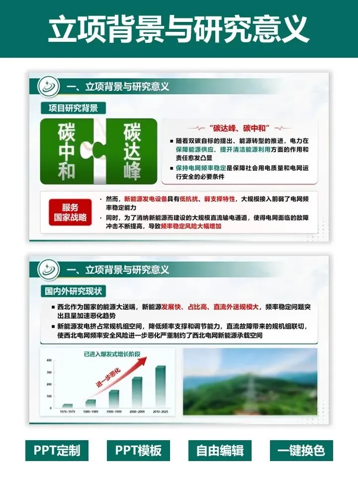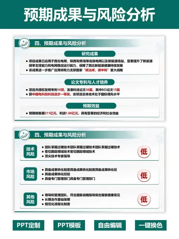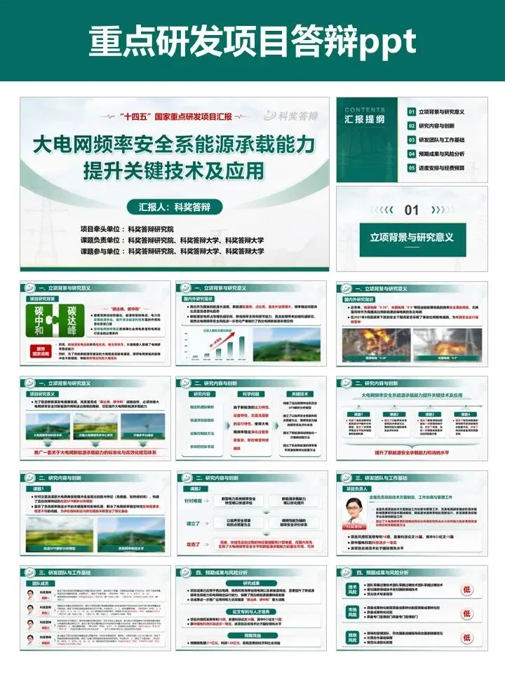 申报国家重点研发项目,答辩 PPT 是拿分关键!这套专为重点研发项目打造的 PPT 模板,深度贴合评审逻辑,帮你高效打造专业答辩材料。模板严格遵循项目答辩标准架构,完整覆盖立项背景、研究内容、创新成果、团队实力、风险分析、进度预算等全流程页面。采用沉稳大气的电力绿配色,数据可视化模块齐全,图文布局清晰,完美适配大电网、新能源等工科类项目。无需从零设计,直接替换内容即可快速出稿,一键提升答辩材料的专业质感与说服力,助力项目顺利通过评审,科研人直接冲!PPT制作及科研绘图相关服务,请联系周老师18701118732(微信)