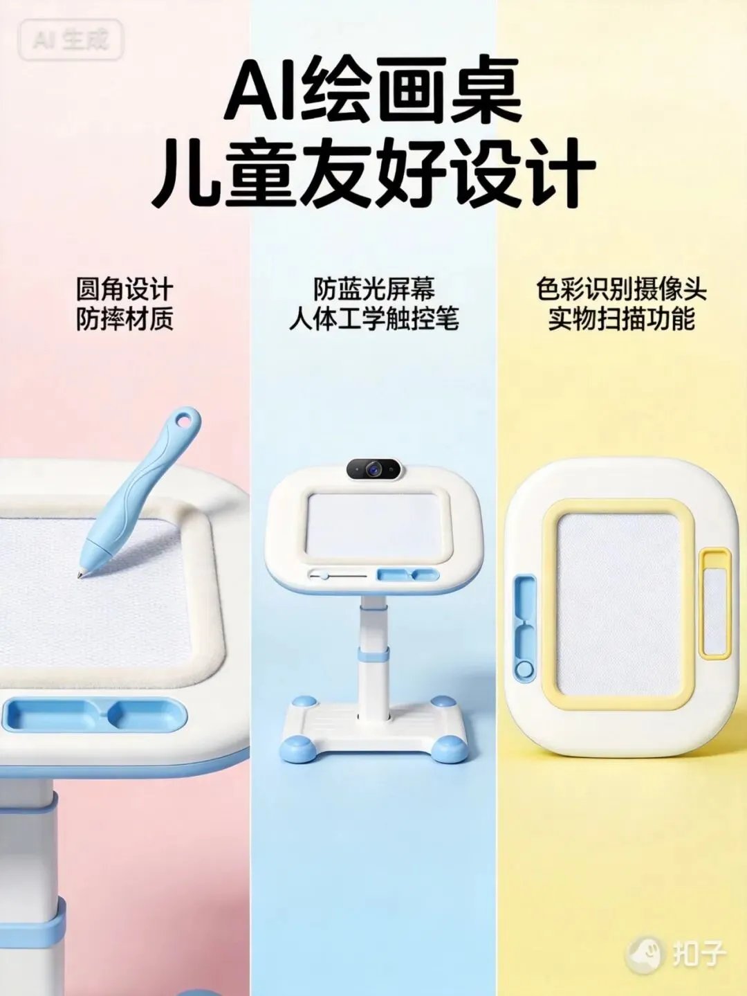 AI绘画桌是基于儿童认知重新设计的专属工具,创新体现在三个层面: