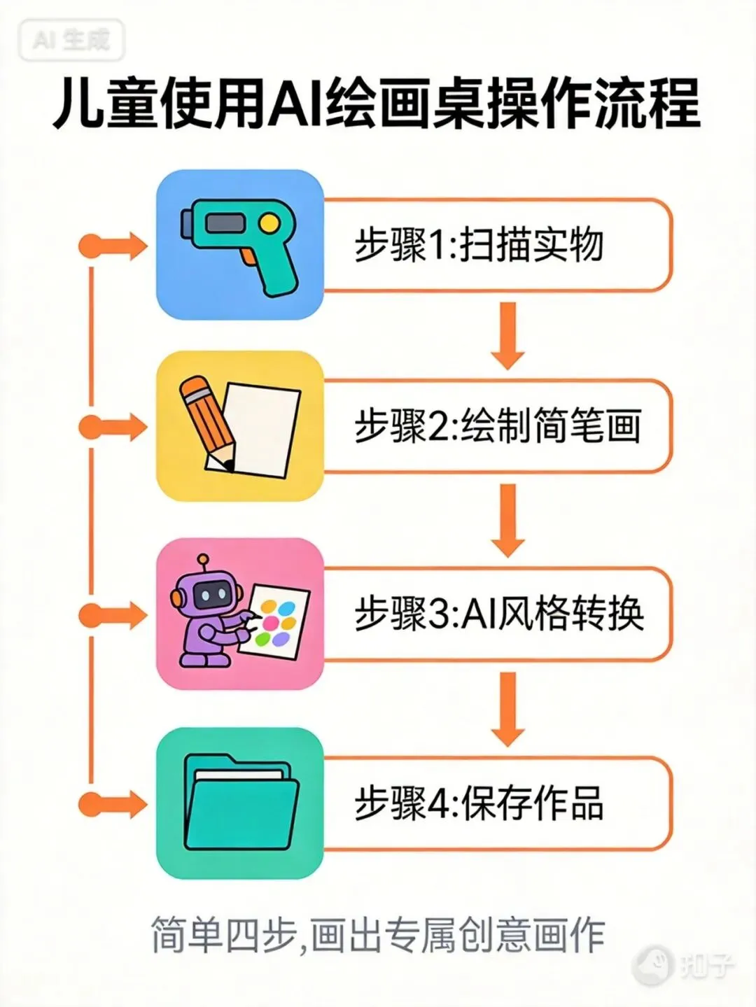 图3:交互流程图解,以信息图可视化儿童使用四步流程:扫描、绘制、转换、保存。彩色图标使复杂技术流程直观易懂,无形中教导“从现实到艺术”的完整创作链条。