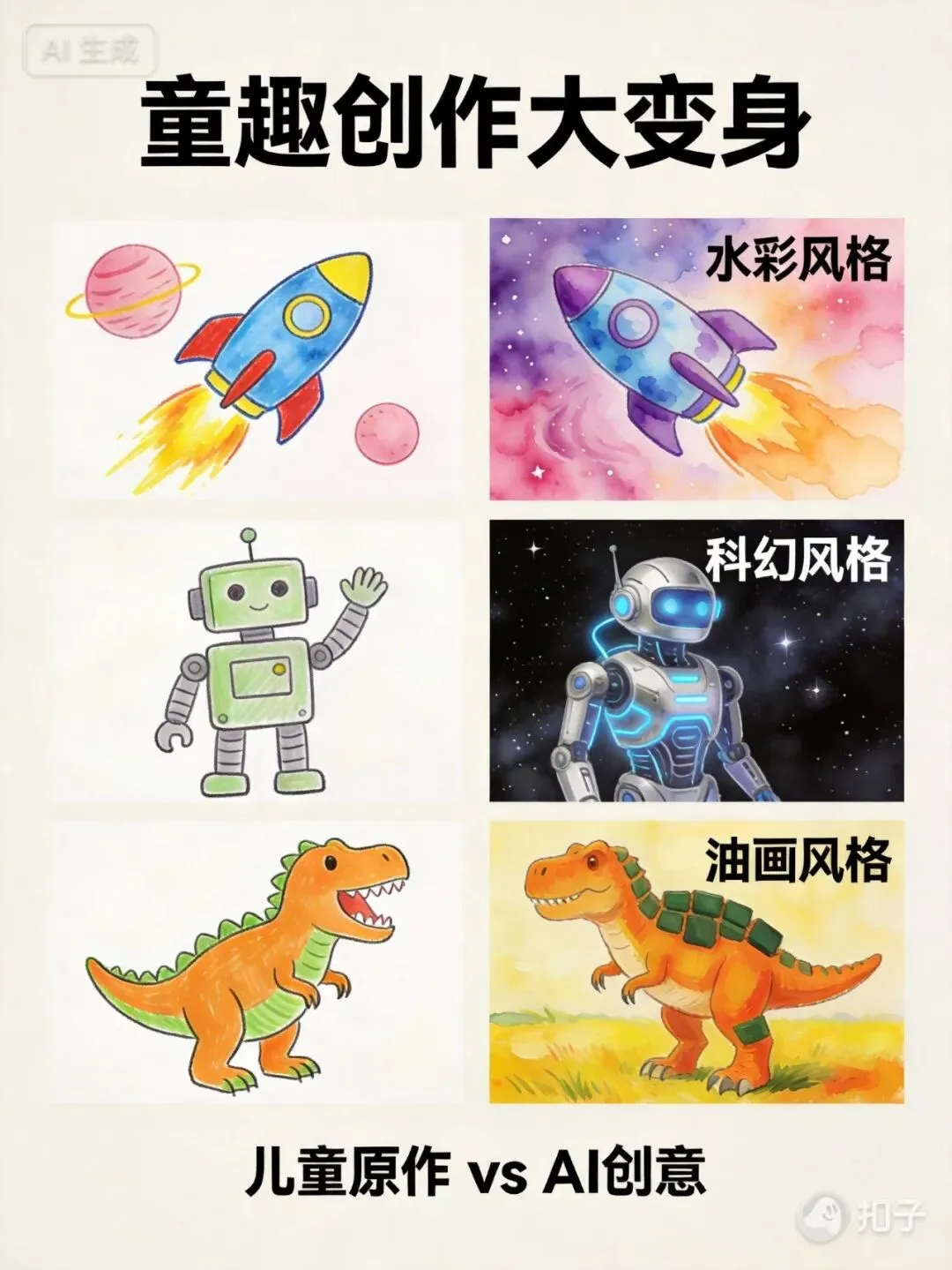 图5:三组儿童简笔画原作与AI转换作品对比,直观展示创意蜕变。左侧是稚趣简笔画,右侧是AI转换后的水彩、科幻、油画风格。对比显示AI增强了视觉表现力,同时忠实保留原作构图趣味——技术是“放大镜”而非“修正液”。