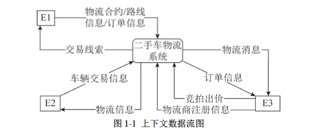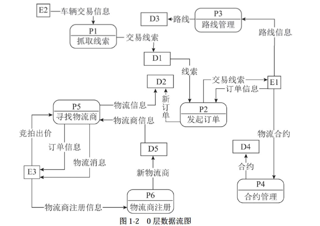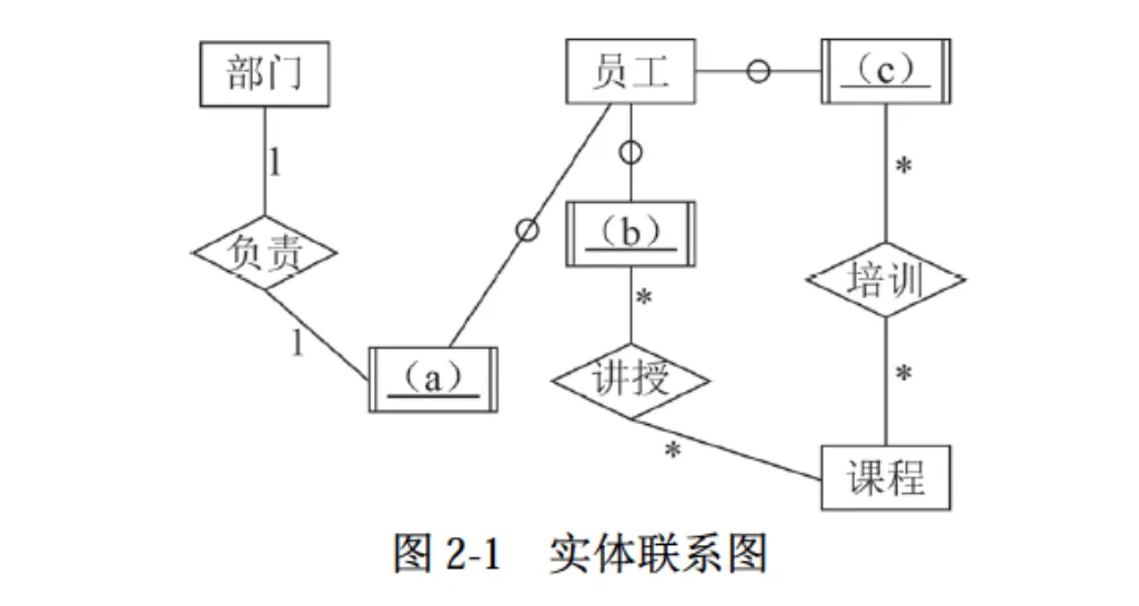 阅读下列说明和数据流图,回答问题 1 至问题 4, 将解答填入答题纸的对应栏内。某公司欲开发一款二手车物流系统,以有效提升物流成交效率。该系统的主要功能是:(1) 订单管理:系统抓取线索,将车辆交易系统的交易信息抓取为线索。帮买顾问看到有买车线索后,会打电话询问买家是否需要物流,若需要,帮买顾问就将这个线索发起为订单并在系统中存储,然后系统帮助买家寻找物流商进行承运。(2) 路线管理:帮买顾问对物流商的路线进行管理,存储的路线信息包括路线类型、物流商、起止地点。路线分为三种,即固定路线、包车路线、竞拍体系,其中固定路线和包车路线是合约制。包车路线的发车时间由公司自行管理,是订单的首选途径。(3) 合约管理:帮买顾问根据公司与物流商确定的合约,对合约内容进行设置,合约信息包括物流商信息、路线起止城市、价格、有效期等。(4) 寻找物流商:系统根据订单的类型 (保卖车、全国购和普通二手车)、起止城市、需要的服务模式 (买家接、送到买家等) 进行自动派发或以竞拍体系方式选择合适的物流商。即:有新订单时,若为保卖车或全国购,则直接分配到竞拍体系中;否则,若符合固定路线和 / 或包车路线,系统自动分配给合约物流商,若不符合固定路线和包车路线,系统将订单信息分配到竞拍体系中。竞拍体系接收到订单后,将订单信息推送给有相关路线的物流商,物流商对订单进行竞拍出价,最优报价的物流商中标。最后,给承运的物流商发送物流消息,更新订单的物流信息,给车辆交易系统发送物流信息。现采用结构化方法对二手车物流系统进行分析与设计,获得如图 1-1 所示的上下文数据流图和图 1-2 所示的 0 层数据流图。使用说明中的词语,给出图 1-1 中的实体 E1~E3 的名称。使用说明中的词语,给出图 1-2 中的数据存储 D1~D5 的名称。根据说明和图中术语,补充图 1-2 中缺失的数据流及其起点和终点。根据说明,采用结构化语言对 “P5: 寻找物流商” 的加工逻辑进行描述。E1 与系统交互物流合约、路线信息、订单信息,对应说明中的 "帮买顾问" 角色;E2 向系统提供交易线索、车辆交易信息,接收系统的物流信息,对应说明中的 "车辆交易系统";E3 向系统发送竞拍出价、物流商注册信息,接收物流消息,对应说明中的 "物流商"。P1(抓取线索)向 D1 写入数据,D1 向 P2(发起订单)提供数据,对应说明中的 "线索" 存储;P2(发起订单)向 D2 写入数据,对应说明中的 "订单信息" 存储;P3(路线管理)向 D3 读写数据,对应说明中的 "路线信息" 存储;P4(合约管理)向 D4 读写数据,对应说明中的 "合约信息" 存储;P5(寻找物流商)向 D5 写入数据,对应说明中的 "物流消息" 存储。对照说明和 0 层数据流图,缺失的关键数据流包括:P2 生成新订单后需要传递给 P5 进行物流商匹配;P5 需要读取路线信息来判断是否符合固定 / 包车路线。 竞拍体系将订单信息推送给有相关路线的物流商,接收物流商的竞拍出价,选择最优报价的物流商中标严格按照说明中的逻辑进行结构化描述,分层次处理订单类型判断、路线匹配判断,以及竞拍体系的处理流程。阅读下列说明,回答问题 1 至问题 4, 将解答填入答题纸的对应栏内。某公司拟开发一套新入职员工的技能培训管理系统,以便使新员工快速胜任新岗位。该系统的部分功能及初步需求分析的结果如下所述:(1) 部门信息包括部门号、名称、部门负责人、电话等,部门号唯一标识部门关系中的每一个元组, 一个部门有多个员工,但一名员工只属于一个部门;每个部门只有一名负责人,负责部门工作。(2) 员工信息包括员工号、姓名、部门号、岗位、基本工资、电话、家庭住址等,其中员工号是唯一标示员工关系中的每一个元组;岗位有新入职员工、培训师、部门负责人等;不同的岗位设置不同的基本工资。新入职员工要选择多门课程进行培训,并通过考试取得课程的成绩。 一名培训师可以讲授多门课程, 一门课程可以由多名培训师讲授。(3) 课程信息包括课程号、课程名称、学时等,其中课程号唯一标识课程关系的每一个元组。根据需求阶段收集的信息,设计的实体联系图 (不完整) 如图 2- 1 所示。根据概念模型设计阶段完成的实体联系图,得出如下关系模式 (不完整):员工 (员工号,姓名,部门号, (d) , 电话,家庭住址)(2) 图 2-1 中是否存在缺失联系,若存在,则说明所缺失的联系和联系类型。根据题意,将关系模式中的空 (d)~(f) 补充完整。(1) 员工关系模式的主键为 (g) , 外键为 (h) ;(2) 讲授关系模式的主键为 (i) , 外键为 (i) 。员工关系是否存在传递依赖?用 100 字以内的文字说明理由。(1) 部门和负责人是一对一关系(一个部门只有一名负责人),所以 (a) 为 1;培训师和课程的讲授关系是一对多(一名培训师可以讲授多门课程),所以 (b) 为 1;培训联系需要记录成绩,所以 (c) 为成绩。(2) 需求中新入职员工需要选择多门课程培训并取得成绩,所以员工和课程之间存在多对多的培训联系,且包含成绩属性。(d) 根据员工信息需求,需要补充岗位和基本工资;(e) 课程关系的主键是课程号;(f) 培训关系需要关联员工号和记录成绩。(i):课程号,培训师;外键:课程号,培训师(培训师对应员工号)(1) 员工关系的主键是员工号,部门号是引用部门关系的外键;(2) 讲授关系的主键是课程号和培训师的组合,两者分别是课程和员工关系的外键。存在传递依赖。因为