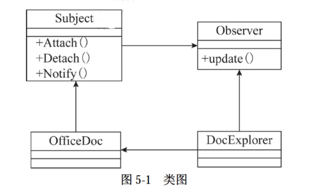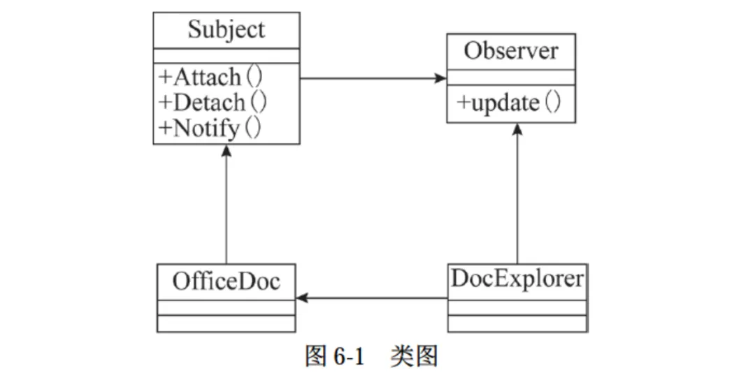 (1) virtual void update () = 0;(1) Observer 类是抽象类,需要定义纯虚函数 update ();(2) Subject 维护的观察者列表是 Observer 指针的向量;(3) Notify () 方法需要调用每个观察者的 update () 方法;(4) DocExplorer 的构造函数需要接收 Subject 指针;(5) DocExplorer 构造时需要将自身注册到 Subject 的观察者列表中。阅读下列说明和 Java 代码,将应填入 (n) 处的字句写在答题纸的对应栏内。某文件管理系统中定义了类 OfficeDoc 和 DocExplorer。当类 OfficeDoc 发生变化时,类 DocExplorer 的所有对象都要更新其自身的状态。现采用观察者 (Observer ) 设计模式 来实现该需求,所设计的类图如图 6-1 所示。