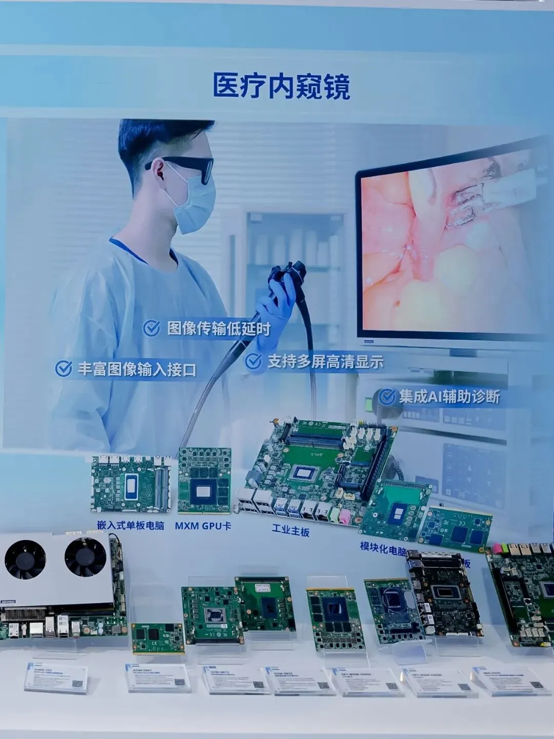 为满足高端4K内窥镜系统对超高清画质与实时AI处理的需求,推荐SOM-6873 COM Express核心模块和 AIMB-2210 Mini-ITX工业主板,其板载AMDRyzen嵌入式8000系列处理器,集成的强大GPU与16 TOPS NPU,支持4个独立4K多屏显示,可实现高清影像实时渲染与低延迟传输,高效支撑内镜智能识别与影像增强。