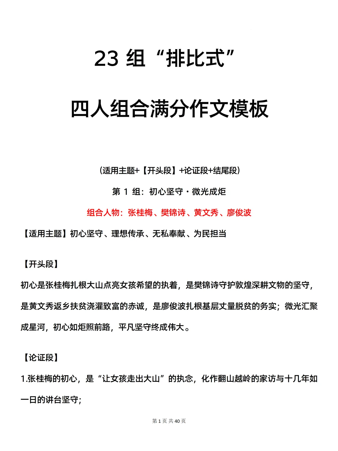 想让作文瞬间惊艳阅卷老师?23组四人组合排比式满分模板来了!覆盖全高频主题,开头、论证、结尾一站式配齐,直接背就能用,让你的作文开篇就有满分气场!