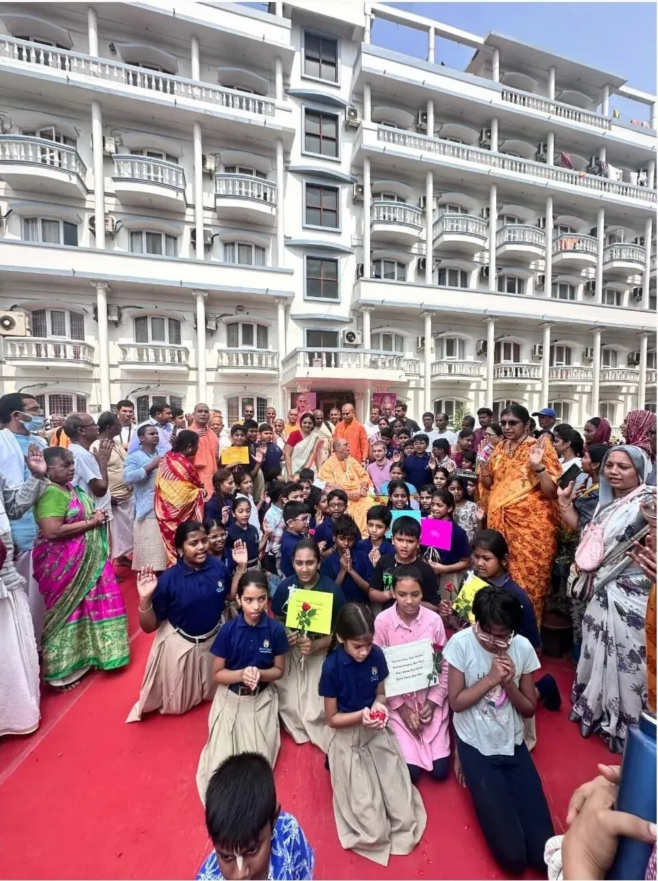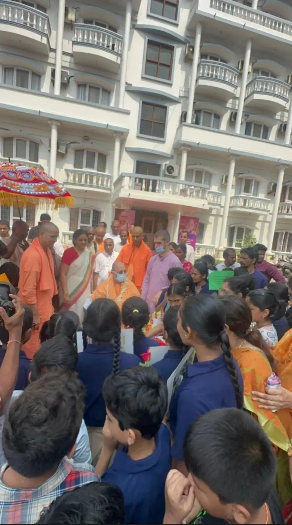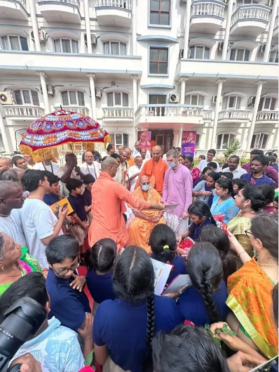 在去曼迪尔的路上,我遇到了“神圣触碰学校”的学生们。他们向我献上了鲜花、水果和一束花,还唱诵了《布茹阿玛-萨密塔》(Brahma-saṁhitā)。