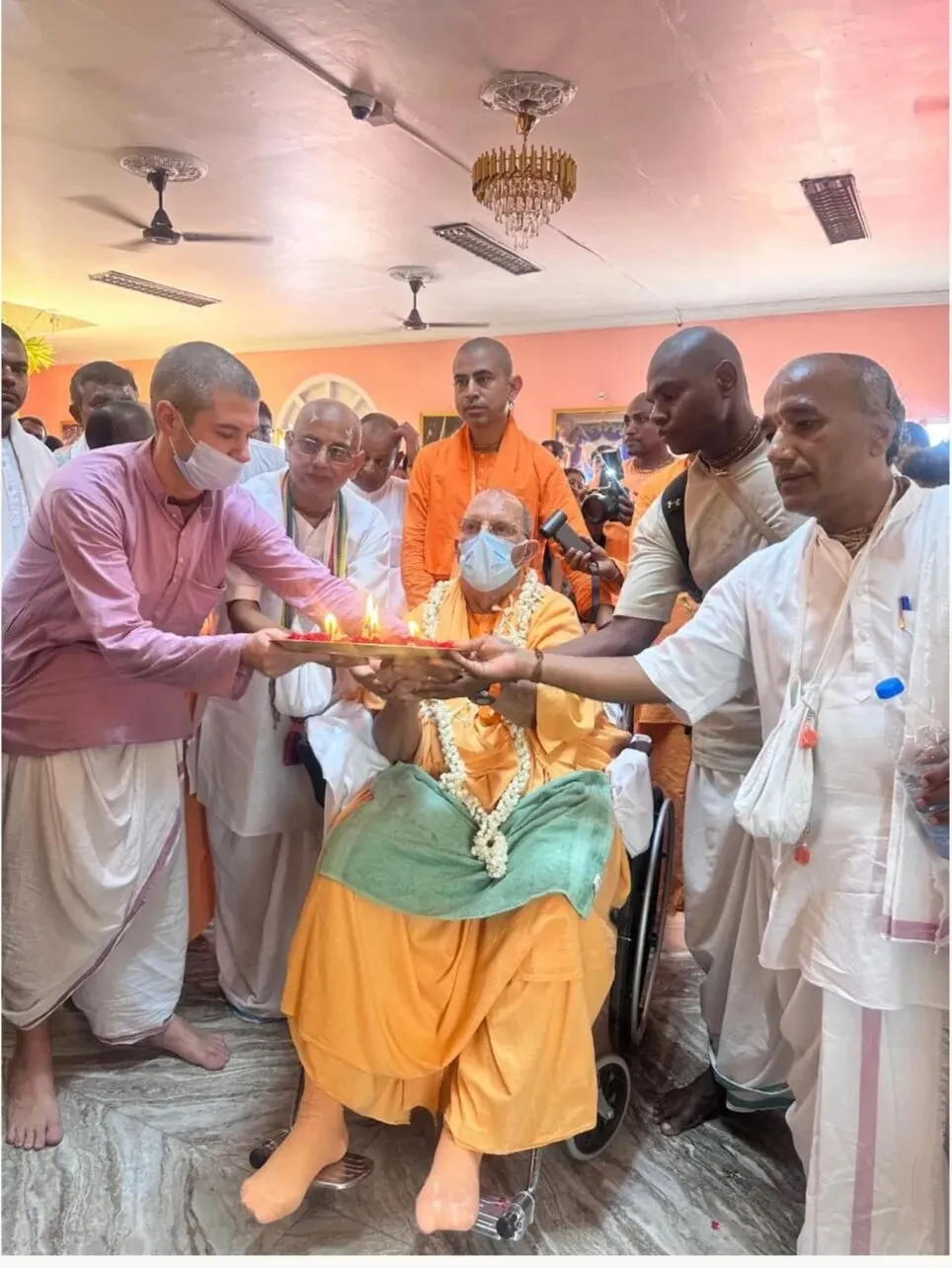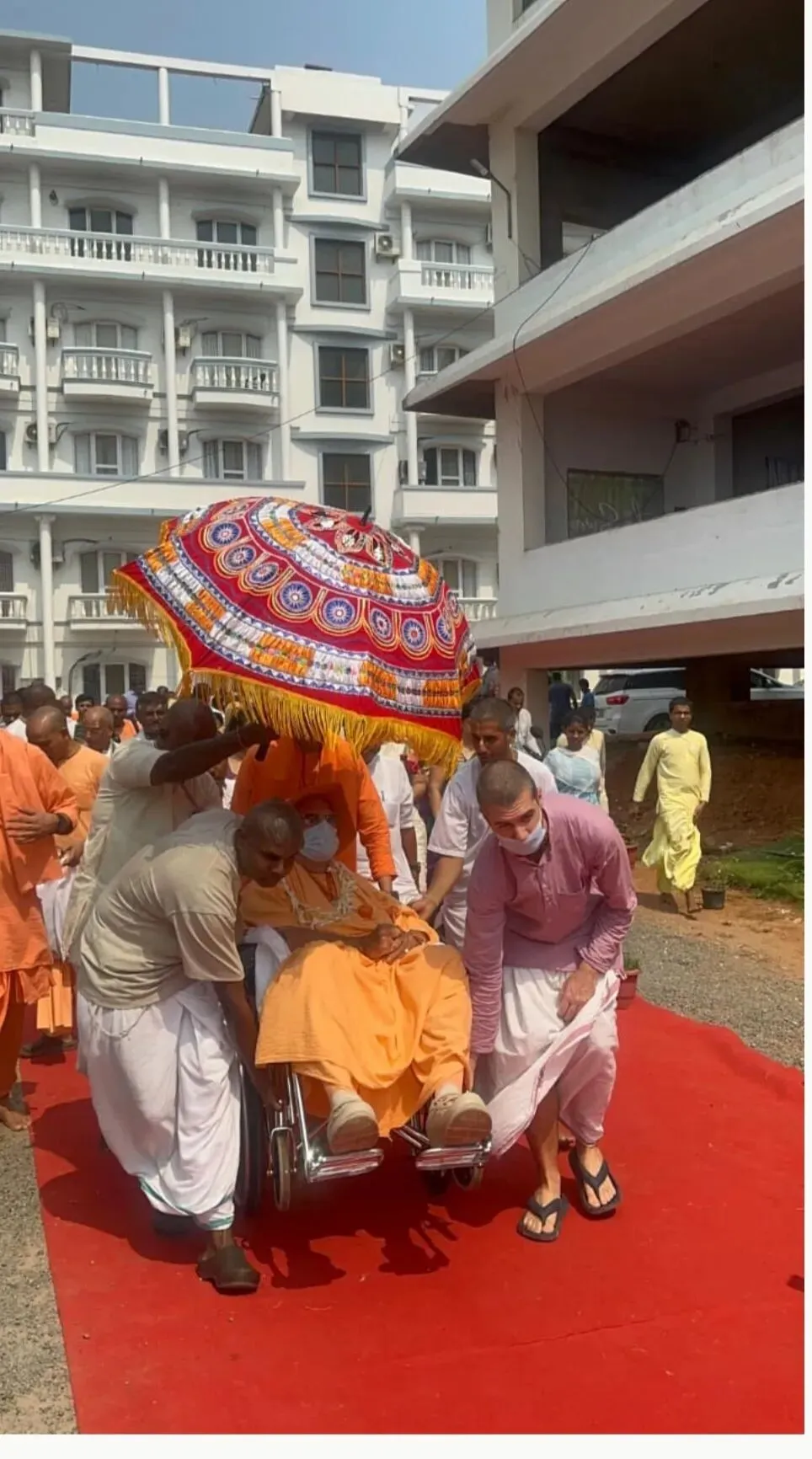 早上6点30分,他们又给我拿了药,还涂了阿育韦达油。之后,从早上6点40分到7点30分,我们做了各种锻炼、呼吸法和嗓音训练。然后我在协助下行走了32步。不光是做这些治疗的时候,一整天我都在唱颂哈瑞•奎师那•玛哈曼绰。