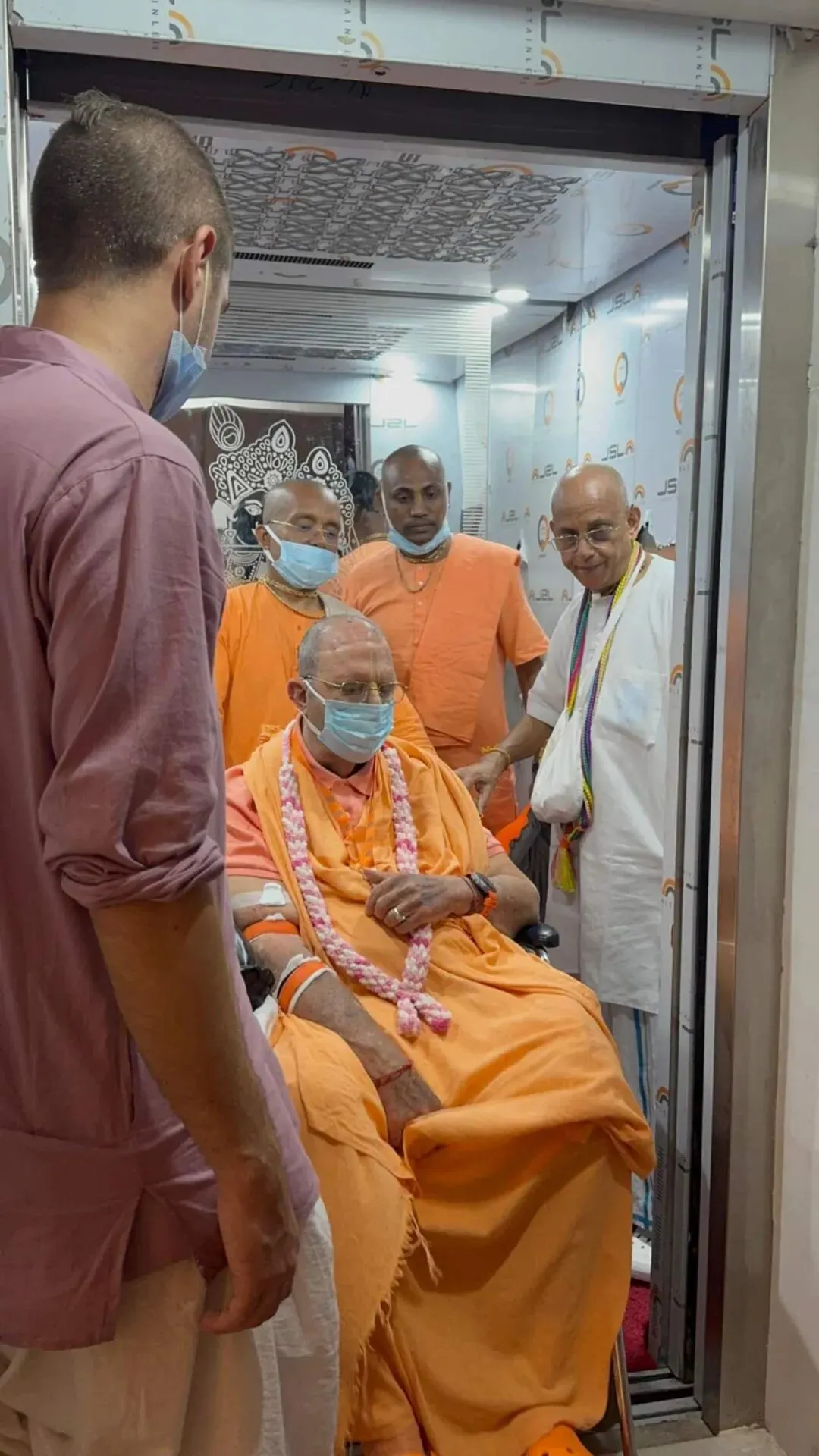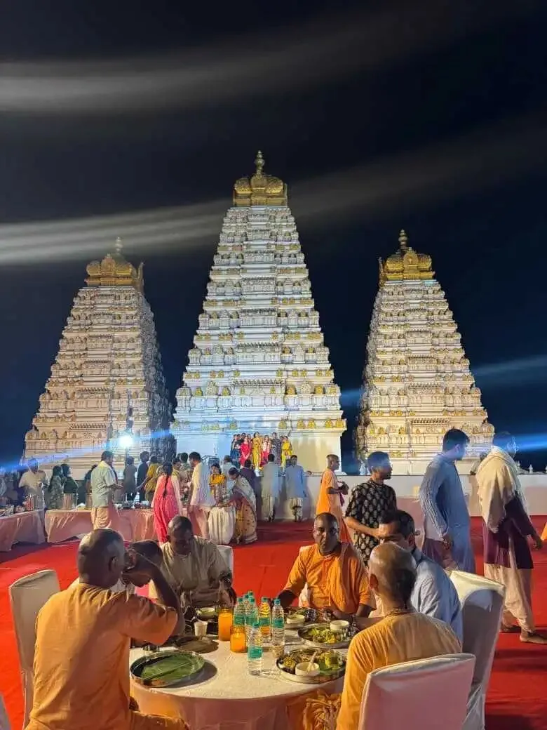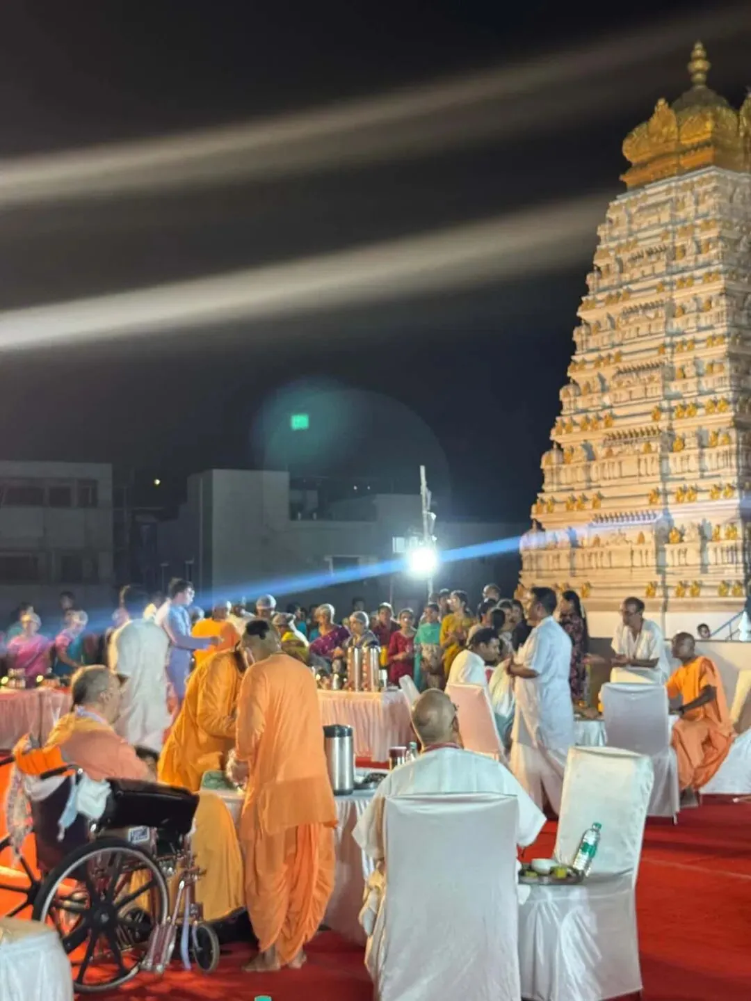 益世康•维萨卡帕特南的奉献者们在屋顶为我的护理人员安排了特别的帕萨达姆(prasādam)盛宴。背景声音有克依尔坦(kīrtana)的唱诵,氛围非常美好。