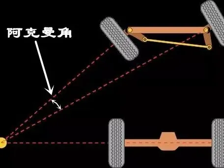 汽车在转弯的时候,内径车轮的角度和外径车轮的角度是不一样的,辆转弯时,内侧车轮转弯半径小、外侧车轮转弯半径大,如果内外轮角度相同,轮胎会发生严重的侧滑、拖拽、偏磨。解决这一问题的核心方案是 阿克曼转向几何(Ackermann Steering Geometry),通过转向梯形机构让内侧轮转角 > 外侧轮转角,保证所有车轮绕同一圆心纯滚动