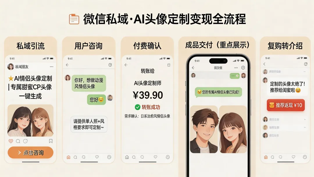 核心逻辑:在小红书、抖音发 AI 生成的头像/壁纸,吸引精准流量,引到微信私域,然后卖定制服务或者周边。