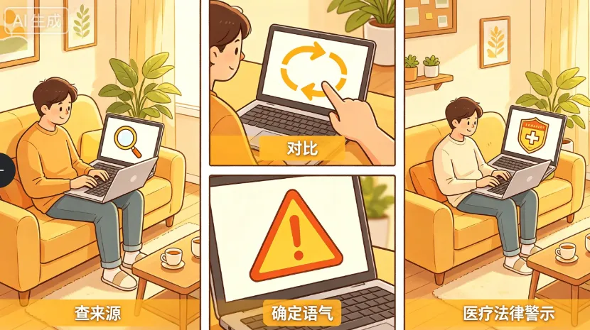 如果AI在陈述一个事实——某本书的作者、某个事件的日期、某项政策的条款——你可以直接追问:"这条信息的来源是什么?"或者"可以提供原始链接吗?"如果AI能够给出具体来源,自己去核实一下。如果它含糊其辞、说"我记不太清了"或者继续编造来源,那就是危险信号。