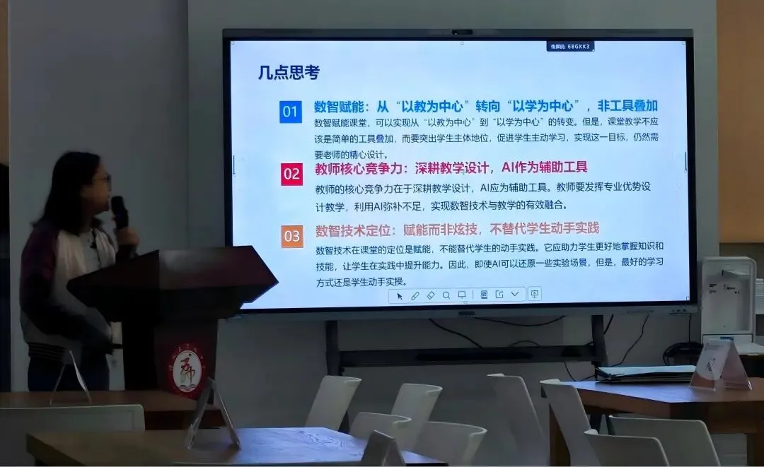 微讲座分享环节,四位来自不同工作坊、不同学科的教师,结合自身教学实践,分享了数智技术赋能教学的宝贵经验。姚水花老师的《数智技术赋能通用技术课堂的教学实践》、张思英老师的《数智技术助力高中地理教学提质增效》、刘洁欣老师的《数值赋能高中数学微专题设计创新实践》,分别从不同学科视角,阐述了如何运用数智技术破解教学难点、丰富教学形式、提升教学质量;彭丽君老师的《人工智能赋能科研写作:小学科学教师专业成长新助力》,则聚焦教师专业发展,为我们揭示了AI技术在科研写作中的应用价值,为教师专业提升提供了新路径。这些分享既有理论高度,又有实践细节,为我们一线教师运用AI赋能教学提供了可借鉴、可复制的经验。