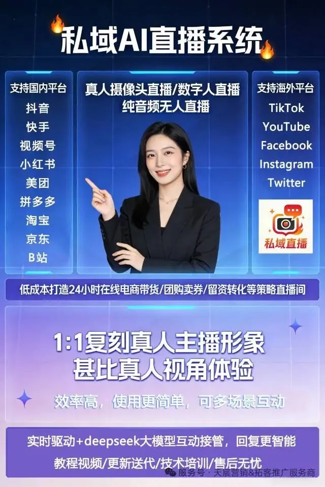 作为拥有自主研发能力的技术源头厂商,致力于为企业提供稳定、务实的自动化直播工具。我们拒绝概念包装,而是通过底层3D建模与AI渲染技术的深度融合,实现了高拟真、低延迟的实时AI数字人直播体验,适用于各类直播场景。我们专注于解决企业直播的核心痛点:全天候获客,不知疲倦 突破真人时长极限,实现7x24小时不间断带货。全时段覆盖,时刻紧盯进线流量,不错过任何成交机会。极简部署,拒绝繁琐 无需组建技术团队,操作流程极致简化。新手也能快速掌握,单人即可极速搭建高水准的个性化直播间。深度定制,降本增效 依托源头技术优势,精准复刻品牌形象代言人。在大幅压缩人力支出的同时,显著提升营销转化率与GMV。