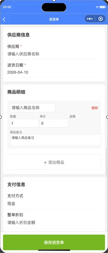 新建一张进货单,填供应商、选商品、输数量,系统自动把库存加上去,同时记录这笔应付款。供应商、商品不需要先添加到管理库,可以根据自己的需要直接添加,保存后自动添加到供应商、商品库。