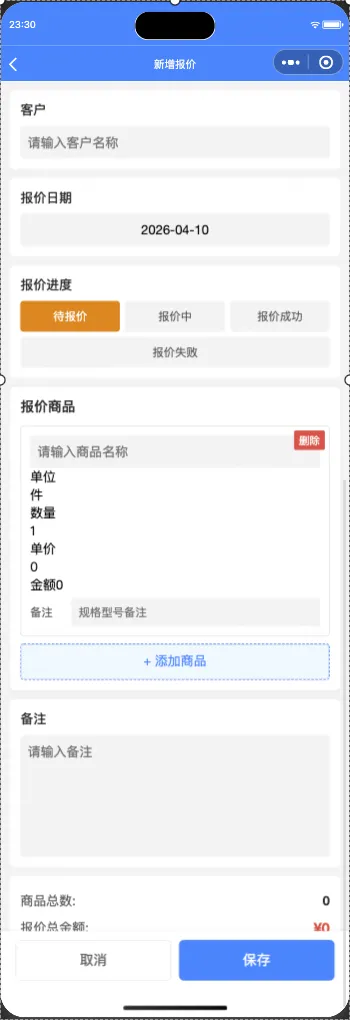 这个小程序的报价单功能支持直接导出成图片,格式规整,有表头、有明细、有合计,发给客户不丢人。