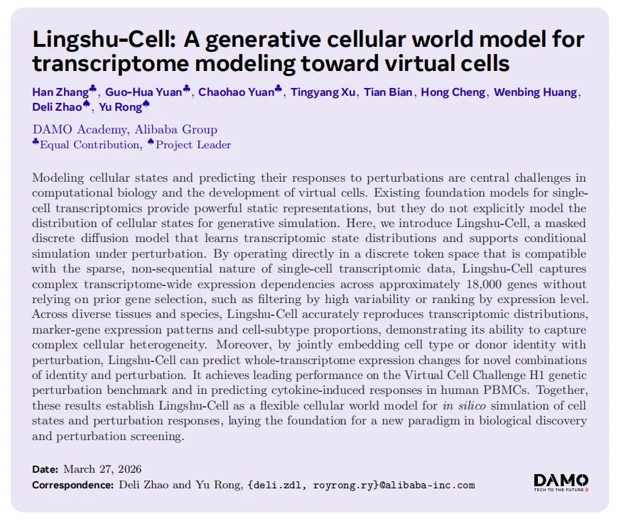 图注:达摩院团队最新发布的研究论文,提出构建面向“虚拟细胞”的生成式单细胞世界模型 Lingshu-Cell(灵枢)