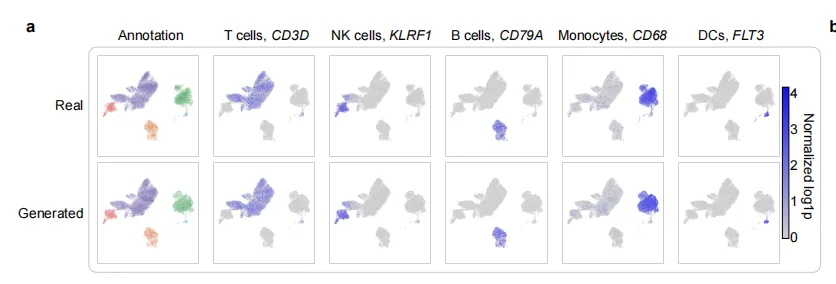 结果显示,该模型不仅能准确重现真实单细胞转录组的分布特征,还能极其精准地复刻特征基因的表达模式和各类细胞亚型的比例 。这表明AI已经掌握了不同生物体内细胞异质性的底层密码 。