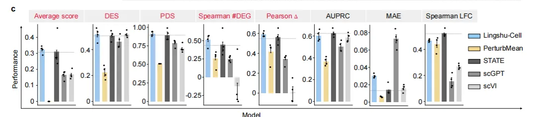 图注: 精准预判基因与药物反应:Lingshu-Cell 在虚拟细胞挑战赛(VCC)等多项基准评估中,多项核心指标均超越现有预测模型