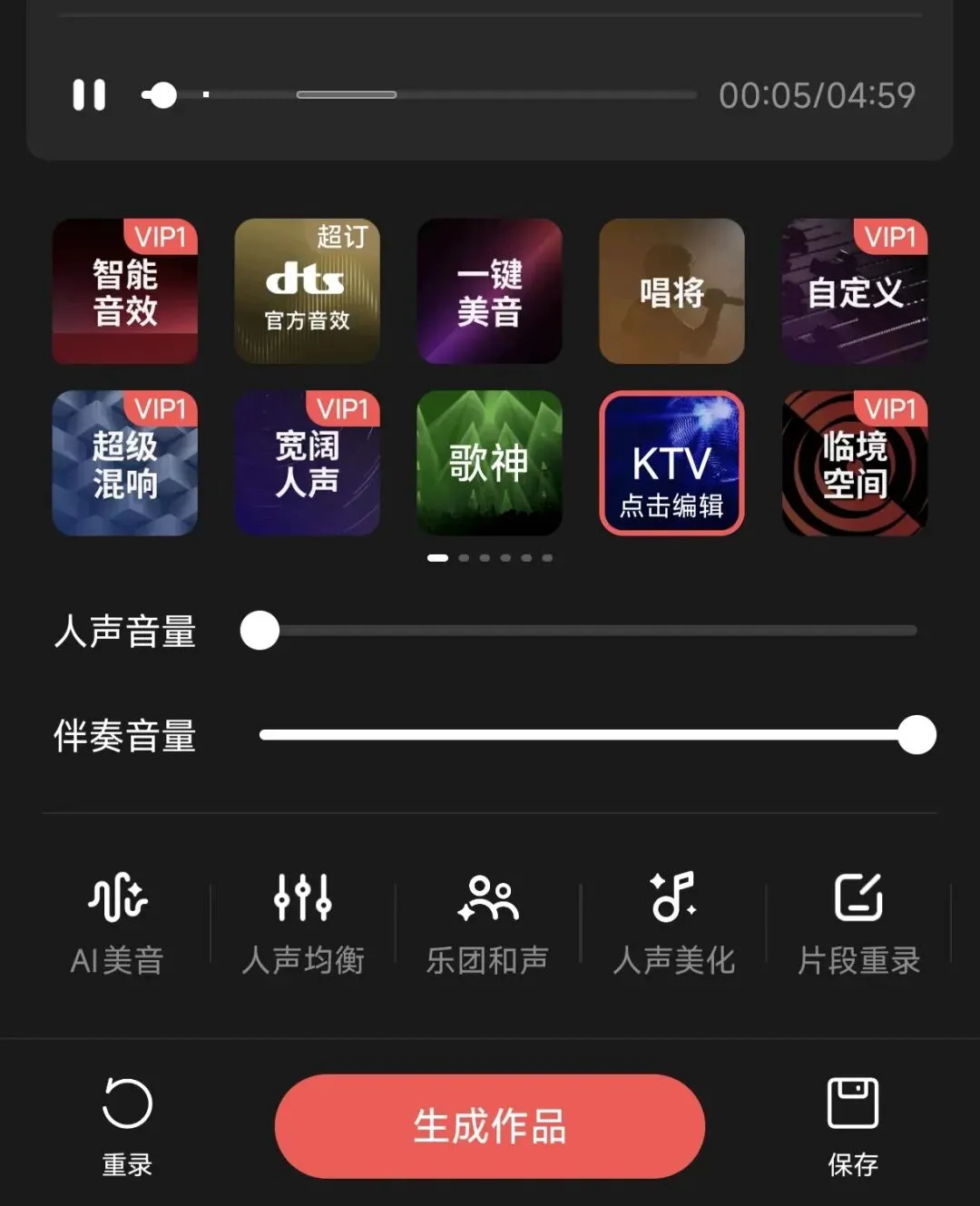 3.结束歌曲之后将人声音量拉到最低,伴奏音量拉到最高,这样便确保我们导出的歌曲便是高质量伴奏了,最后点击右下角保存按键。
