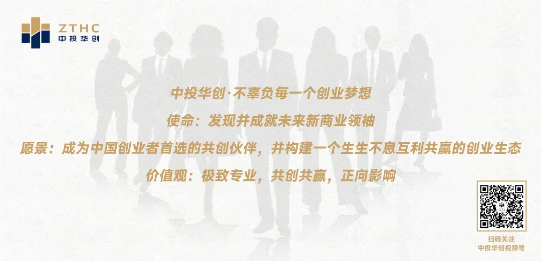 中投华创·不辜负每一个创业梦想使命:发现并成就未来新商业领袖。愿景:成为中国创业者首选的共创伙伴,并构建一个生生不息互利共赢的创业生态。价值观:极致专业,共创共赢,正向影响。