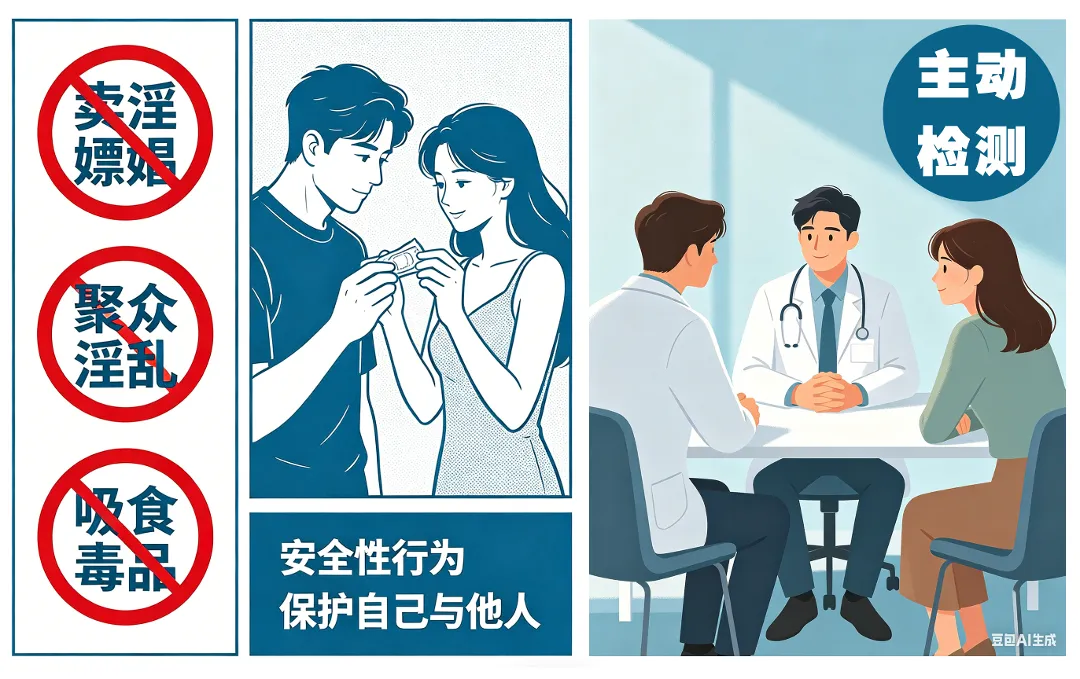 学习防治知识,抵制卖淫嫖娼、聚众淫乱、吸食毒品等违法犯罪行为,坚持安全性行为。发生高危行为后,根据窗口期主动检测。各地疾控中心可提供免费咨询检测。