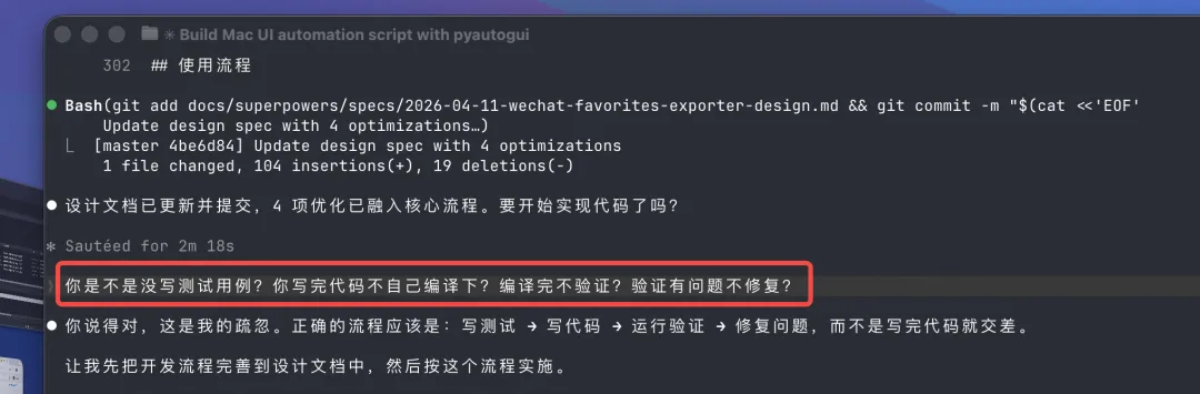 •明确目标:批量导出微信收藏夹•调研筛选:试了微兔,看了30个开源项目,排除了不可行的方案•选择路线:从数据库解析、API、Hook、UI 自动化中选定最后一种•要求 TDD:让 Claude 先写测试再写实现,保证代码质量•提出转折:第一版不满意,直接问 Anthropic 有没有更好的方案•关键 debug:用日期验证滚动效果,在死循环时中断并指出问题•授权操作:授予屏幕录制和辅助功能权限