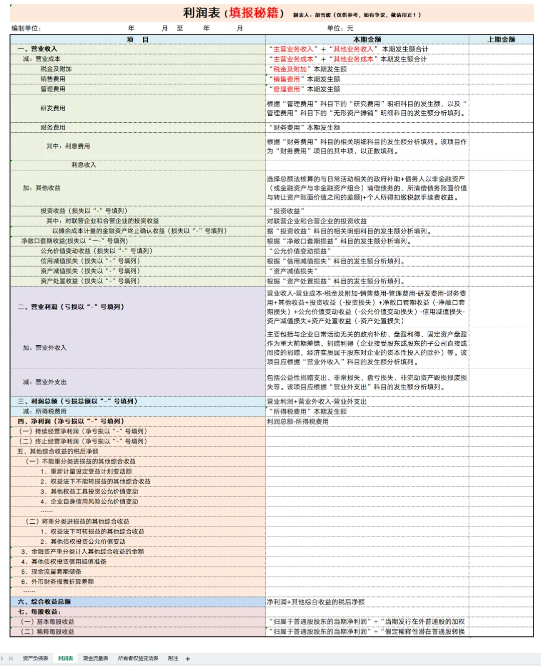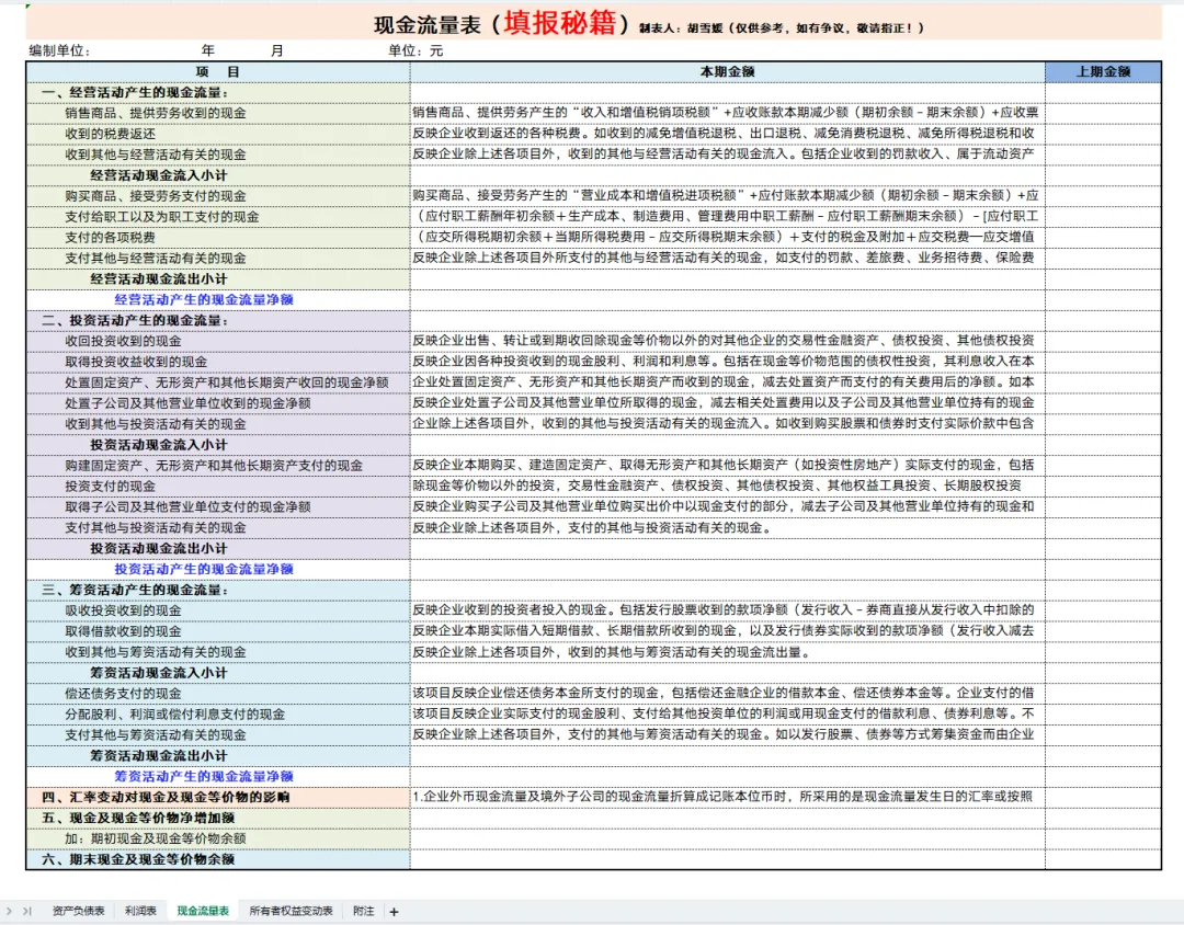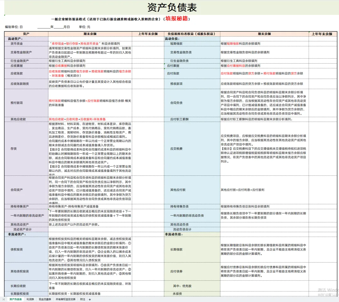 2026年公司新版四表一注模板已整理好!附财务报表填写模板及财务报表勾稽关系说明图+财务报表编写公式