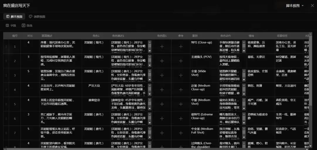 生成角色三视图,还有多角度参考,这样角色的样子就清楚啦。 - 分镜生成