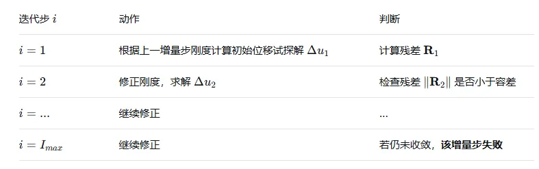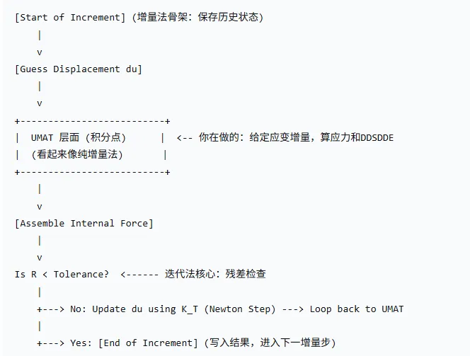 为了解决这个问题,ABAQUS的思路是一种增量和迭代结合的方法。它把加载过程设计成增量,把求解过程设计成迭代方法。根据每一步的刚度矩阵和应力,修正当前位移分布。这也是为什么,ABAQUS UMAT子程序必须要求返回应力的原因,用算出的新应力组装内力向量,然后做全局的牛顿迭代。这也是为什么静力不收敛的原因所在,就是如果应力和刚度矩阵过分不匹配,就无法迭代出符合精度的位移。